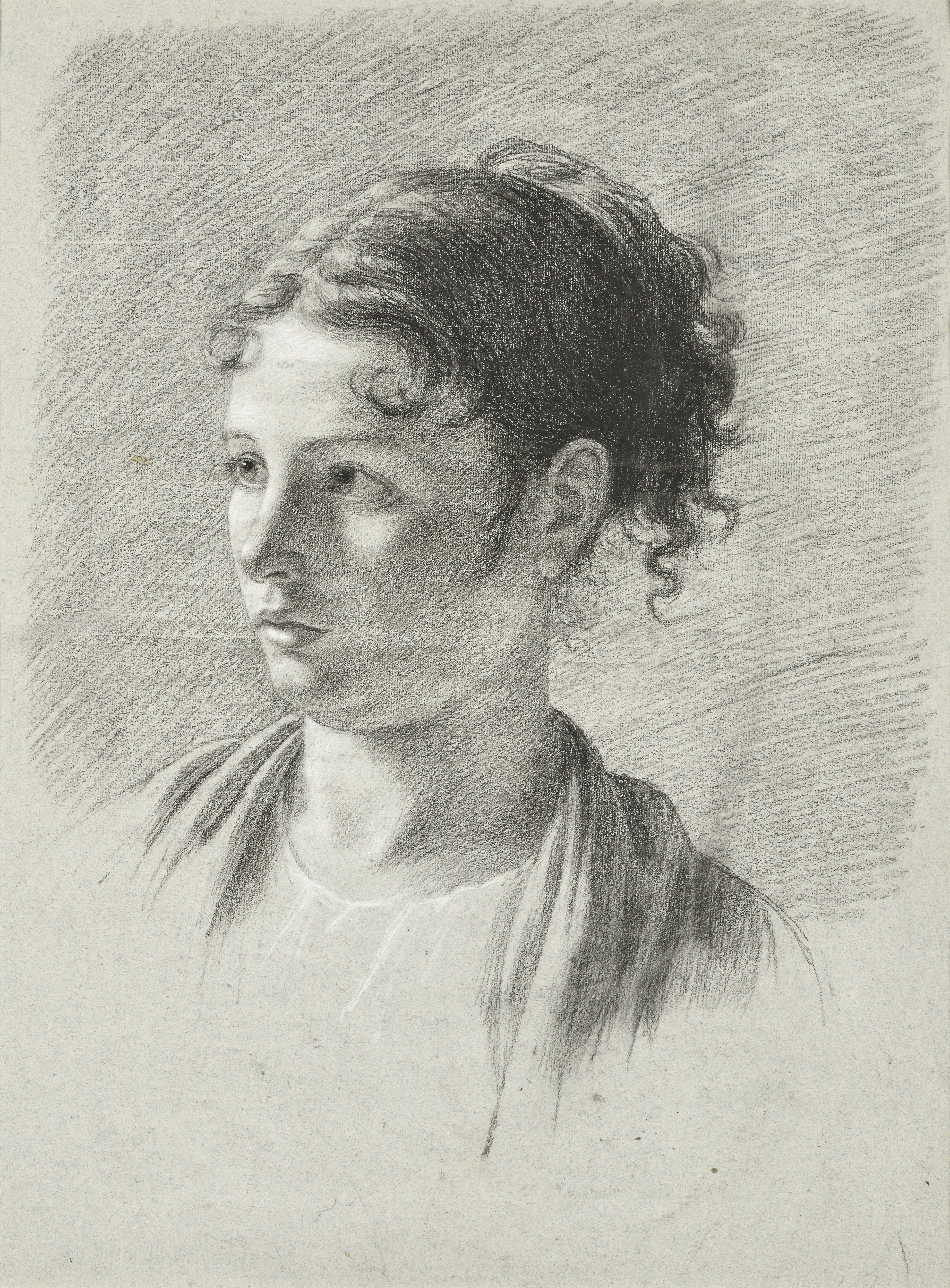 On a large sheet of blue paper, characteristic of Mme Auzou’s drawn works, appears the profile of a young woman, whose soft, rounded treatment conveys a sense of gentleness and innocence. Like her master, Jean-Baptiste Regnault (1754–1829), Auzou specialised in portraiture. The numerous study sheets she produced reveal the great attention she paid to capturing the psychological depth of each of her models, which served as references for her painted works. The face of this young woman can easily be compared to that of Daria in her masterful painting *Daria or Maternal Terror* (ill. 1), which the artist presented at the Salon in 1810.