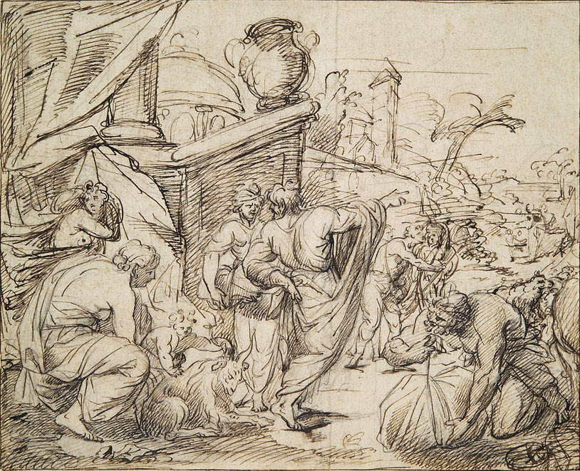 Ici, le personnage central pointant du doigt l’horizon est Abraham désignant la Terre Promise que lui et son peuple viennent d’atteindre. Les personnages qui l’entourent semblent éreintés et portent encore leurs lourds paquetages qu’ils posent à peine au sol. Si l’on se conforme aux Ecritures l’homme à qui le patriarche s’adresse pourrait être Loth, son neveu. Le personnage féminin est trop jeune pour correspondre à Sarah mais pourrait être Agar, la seconde épouse d’Abraham.