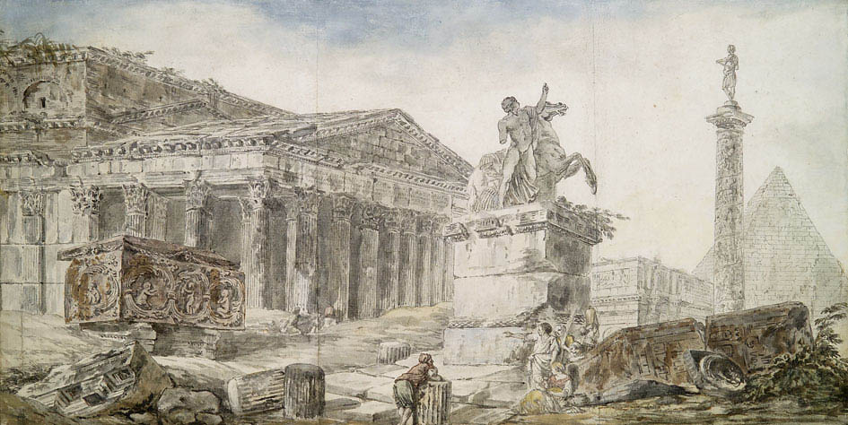 Les artistes italiens travaillant à Rome au XVIIIe siècle, avaient à cœur de peindre, dessiner et graver la ville sous tous ses aspects. A l’Académie, Natoire succédant au directorat de Jean-François de Troy, ajouta de nouveaux exercices au programme des études des académiciens : il encouragea vivement le dessin de paysage. C’est dans ce contexte qu’évolua Hubert Robert. Influencé par Panini (1691-1765) et Piranèse (1720-1778), il s’attacha à glorifier Rome par la représentation des monuments de la ville.
