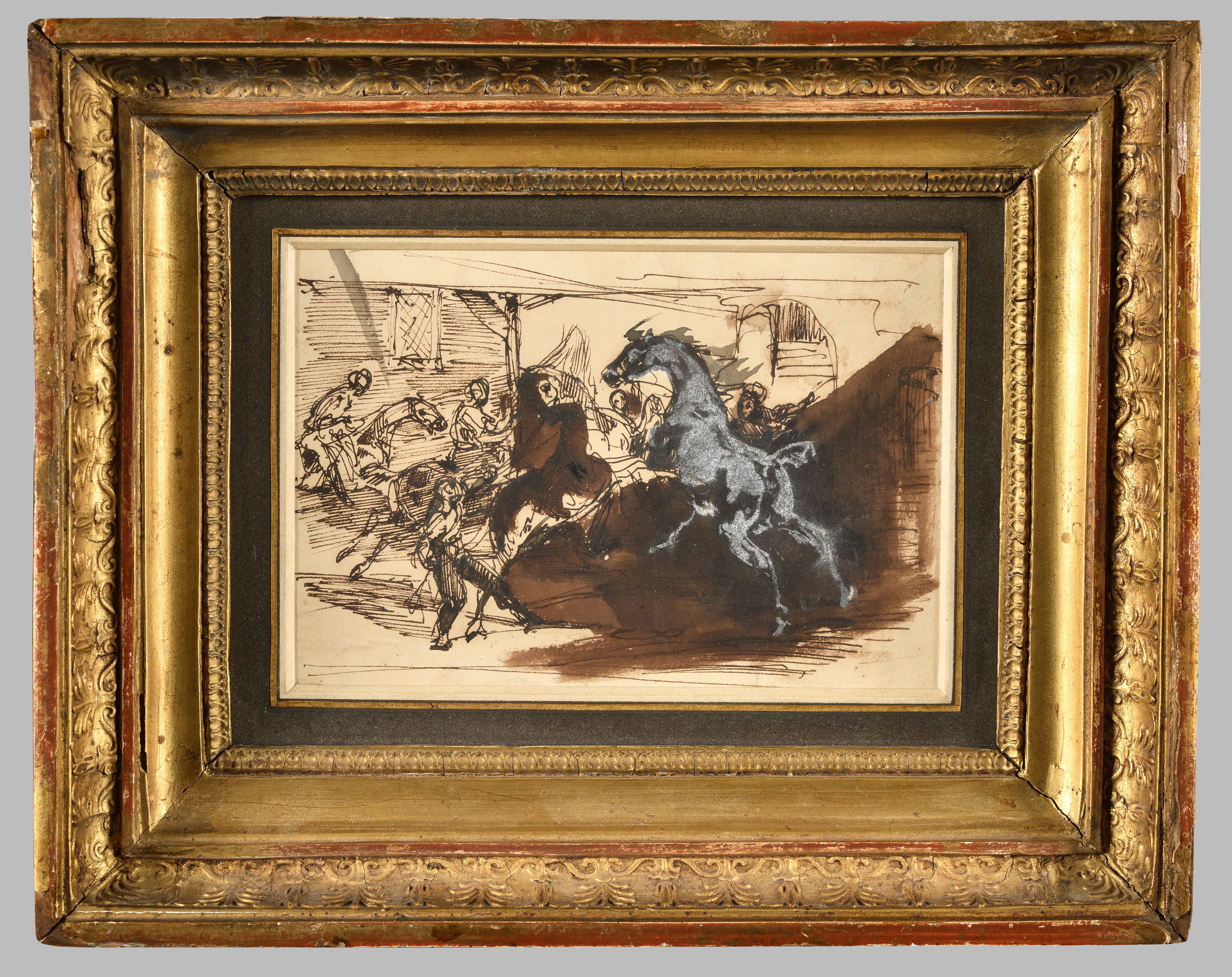 La carrière de peintre militaire implique l’étude rigoureuse de la cavalerie à travers l’observation de l’anatomie des chevaux. Tout comme son aîné Géricault, Vernet témoigne d’une brillante facilité dans leur exécution. Notre dessin atteste de l’influence du séjour italien de l’artiste. Le sujet est familier, il est traité par Géricault en 1817 (ill. 1) : il s’agit de l’une des nombreuses esquisses qui devait servir à l’exécution d’une œuvre mesurant une dizaine de mètres de largeur qui ne sera finalement jamais réalisée.