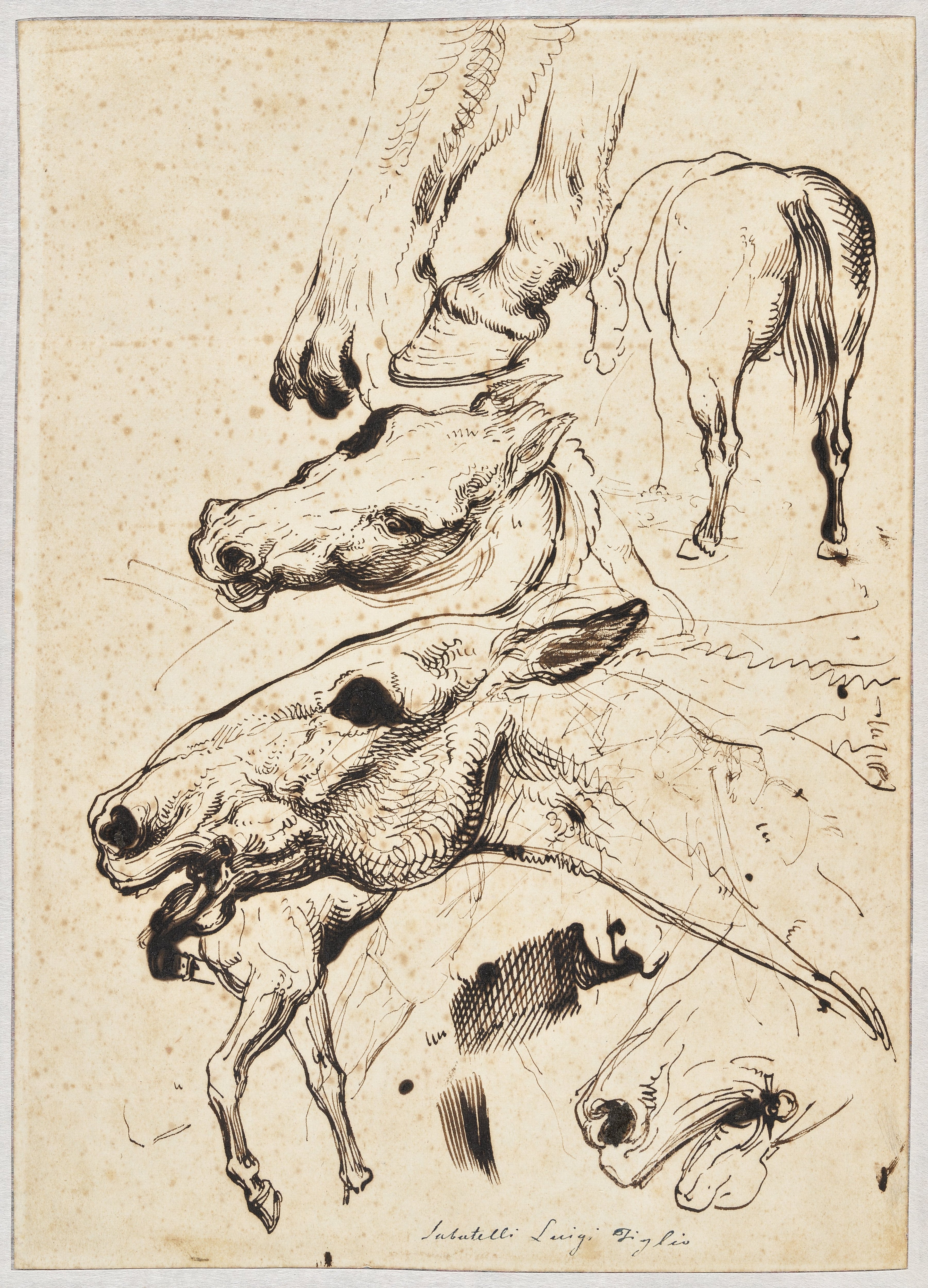 Notre dessin illustre la pensée créative de l’artiste. Sur une feuille de papier beige, Sabatelli trace à la plume quelques études de chevaux. Probablement croqué sur le vif, il reproduit avec une grande acuité les particularités anatomiques de l’animal. La musculature est rendue par un savant jeu de hachures, les figures sont cernées par un trait plus appuyé d’encre brune et d’encre ferrogallique, jadis utilisée par ses aînés italiens du XVIe et du XVIIe siècle. L’œuvre comprend deux études de têtes, une étude de museau, deux études de jambes mais également une étude de cheval vu de dos, démontrant ainsi la capacité de l’artiste à rendre ses figures en raccourci.