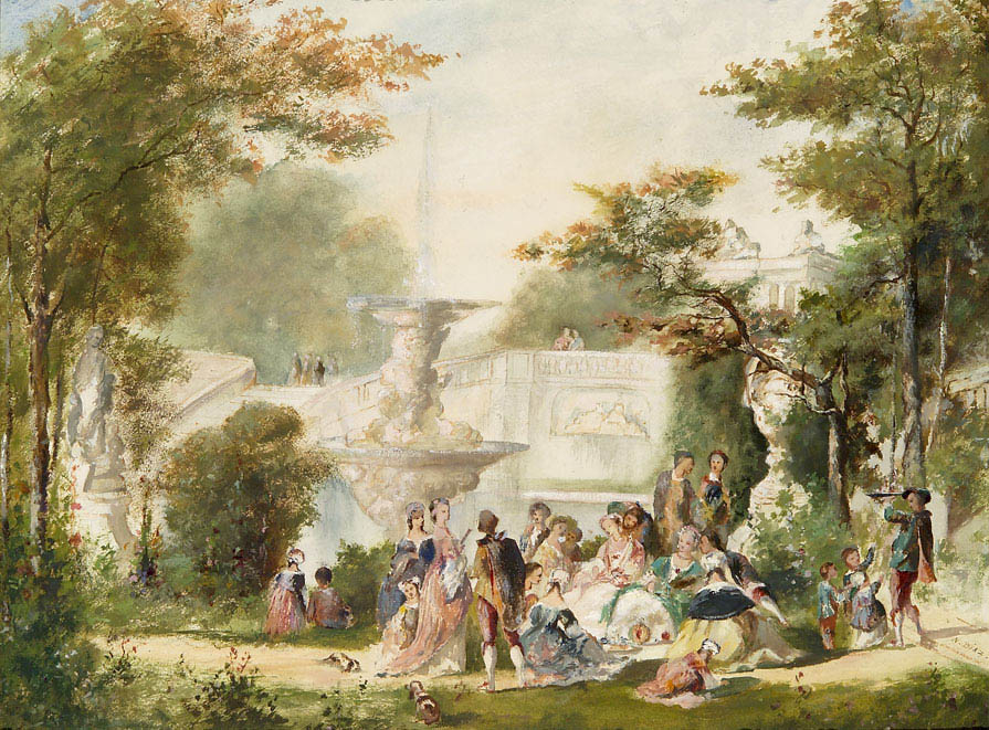 La scène se passe dans un parc qui pourrait se rapprocher dans sa structure des jardins italiens de la Renaissance. En effet, l’architecture de pierres blanches formant les escaliers, la fontaine centrale et un petit palais que l’on retrouve dans le dessin est proche de celle des jardins Boboli à Florence. Par ailleurs, les sculptures romaines ornant les allées du parc du dessin sont aussi des éléments très présents dans les jardins italiens. Le groupe de personnes que l’on voit au centre de la composition est en train de déjeuner, assis dans le parc. Il s’agit majoritairement de femmes et d’enfants. Les femmes semblent discuter ensemble. Les enfants, quant à eux, vaquent à leurs occupations autour du cercle principal.
