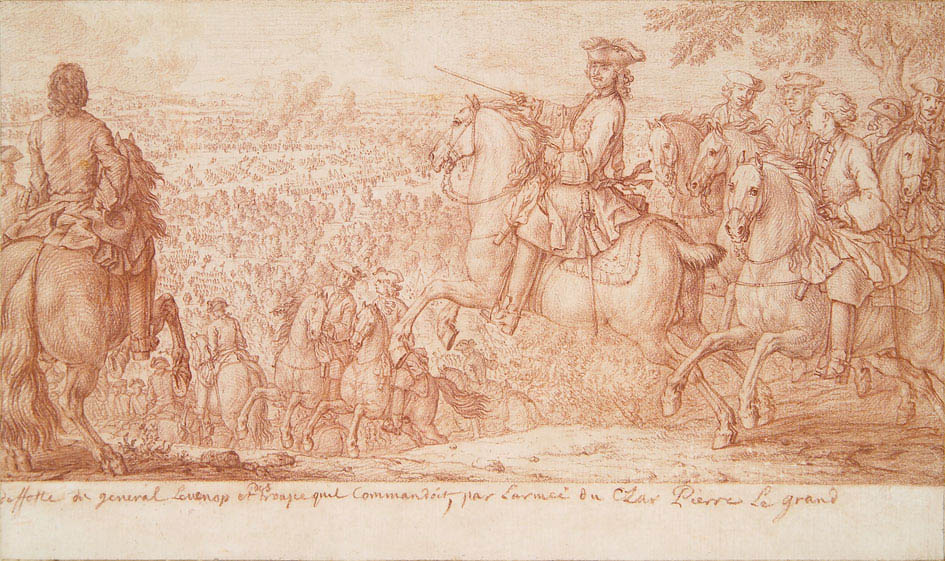 Notre belle sanguine est probablement un dessin préparatoire pour la gravure de la bataille de Lesnaya, dont elle représente un détail. On retrouve le goût de l’artiste pour l’organisation de l’espace en différents plans, la perspective lointaine et la précision topographique du lieu. Ici la compostion est mise au service du Tsar, célèbré en héros militaire et orchestrant le champ de bataille avec son bâton de commandement.