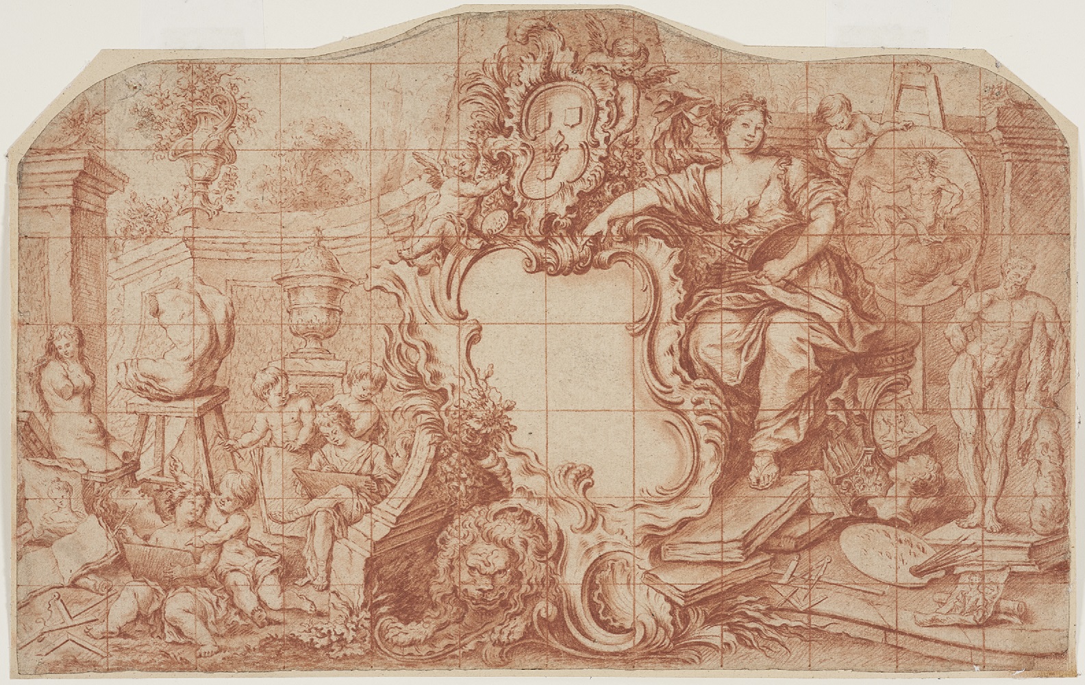Avec son esthétique typique du rocaille épanoui des années 1730, notre dessin reprend et étoffe le même thème en célébrant l’Académie à travers la représentation allégorique. Le blason aux trois écussons orne le cartouche adossé à une construction pyramidale au centre de la feuille. Il est soutenu par un génie ailé, tandis qu’un autre, une palette à la main, pointe son index vers les armoiries. Au-dessous est fixé un autre cartouche, vide celui-ci et destiné vraisemblablement à accueillir une inscription que désigne la Peinture reconnaissable à ses attributs : palette, pinceaux et repose-poignet. En bas, entre les volutes et les coquilles du grand cartouche, un lion se tapit. De part et d’autre du monument, dans ce qui s’avère une fabrique de parc à la française, sont disposés des ouvrages, des gravures, des sculptures célèbres dont l’Hercule Farnèse et le Torse du Belvédère, une Vénus Médicis aux cheveux épars, des vases, des bustes, des chapiteaux, un tableau ovale montrant Apollon avec sa lyre, des rouleaux de papier et des instruments de géométrie nécessaires à la construction de perspective, à savoir des compas de proportion et des équerres. On y découvre également des putti dessinant. L’ensemble est mis au carreau pour faciliter le transfert : il s’agit sans doute d’un projet de gravure et, plus exactement, d’un frontispice ou d’un en-tête, le cartouche vide attendant de recevoir sa légende en contrepartie. L’œuvre préparée par notre sanguine reste à découvrir, mais il pouvait s’agir soit d’une commande de l’Académie, soit d’une composition suffisamment ambitieuse pour apporter à son auteur l’agrément de la compagnie.