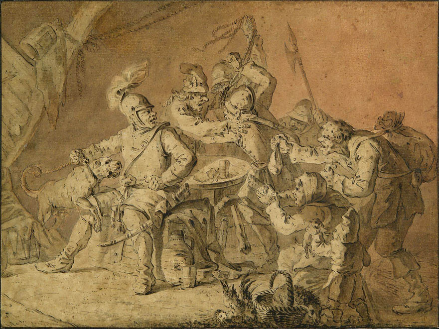 Cet artiste au pinceau délicat a su traiter le portrait et la scène de genre avec infiniment d’humour et de caractère. Notre feuille ici en témoigne avec ces deux scènes pleines de vie : la première est un instant suspendu au cœur d’une taverne, probablement à une heure avancée de la nuit, celle où les esprits avinés s’échauffent. On entend presque les aboiements du chien et les cris des hommes, les chaises se renverser et les verres s’entrechoquer.