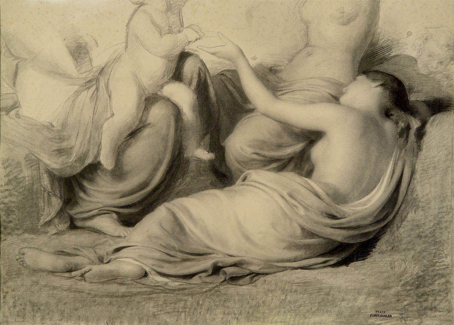 Fritz Zuber Buhler fait partie de ces artistes venus chercher à Paris une sorte de consécration artistique. Contemporain (et proche dans le style) de William Bouguereau et d’Alexandre Cabanel, l’artiste fait état dans ses œuvres d’une formation académique certaine, à la fois dans leur exécution et dans leur thème, comme en témoigne notre dessin et sa vision rêvée d’un groupe de femmes. Il a probablement été influençé par le style officiel qui a marqué le XIXè siècle français, cet « art pompier » basé notamment sur une connaissance approfondie du corps humain et sur la correction des imperfections par l’étude de l’Antiquité gréco-romaine.