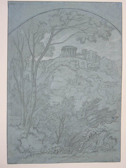 Pierre noire et rehauts de craie blanche sur papier bleu. Signé en bas à gauche et situé en haut à gauche