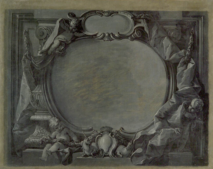 Les peintures en camaïeu ou comme ici” en grisaille” si elles sont dans les tons gris sont généralement réservées à des motifs d’architecture en trompe – l’oeil. C’est du moins la définition qu’en donnent les dictionnaires de peinture de Lacombe ou Pernety dans les années 1750, qui expliquent que ”cette manière est employée pour représenter les bas-reliefs de marbre ou de pierre blanche”. Les motifs de putti entourant ici le cartouche situent ce dessus de porte vers 1745. Sa composition d’ensemble rappelle le Livre de cartouches publié par Huquier d’après des modèles tirés des Tombeaux des Princes. Les deux licornes associées aux putti évoquent également les modèles des tombeaux de Guillaume Cowper ou de Guillaume III mais dans une composition ordonnée et simple caractéristique de la maturité de l’artiste.