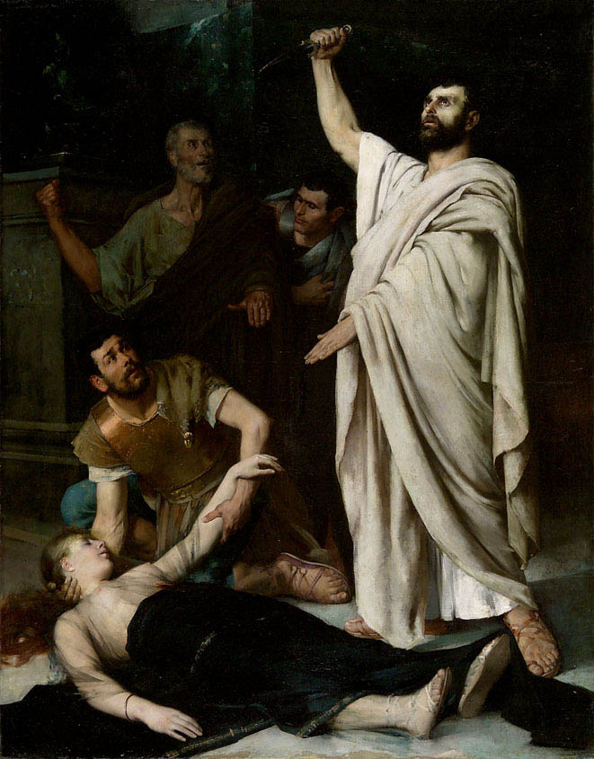 Notre huile sur toile probablement exposée au concours du Prix de Rome en 1883 illustre un passage de l’histoire romaine du VIe siècle avant Jésus Christ, s’imposant comme un morceau de bravoure de l’art pompier. De composition pyramidale, l’œuvre dévoile la scène tragique au premier plan, : Lucrèce, l’épouse mourante de Lucius Traquinius Collatinus gît à terre, son mari à genoux lui prend la main, le père de la jeune femme est derrière le mari, nous retrouvons également le messager et Brutus qui ferme la pyramide. Entre mythe et réalité, l’histoire antique nous lègue le récit suivant : à la suite du déshonneur enduré, Lucrèce envoie un messager chercher son mari et son père, que nous retrouvons dans notre composition rassemblés autour de la jeune femme. Sur le chemin qui les ramène à la maison, Lucius croise son ami Brutus, neveu du roi Tarquin le Superbe qui décide de les accompagner. Sur le lieu du drame, Lucrèce fait porter serment à son mari Lucius de la venger puis se suicide.