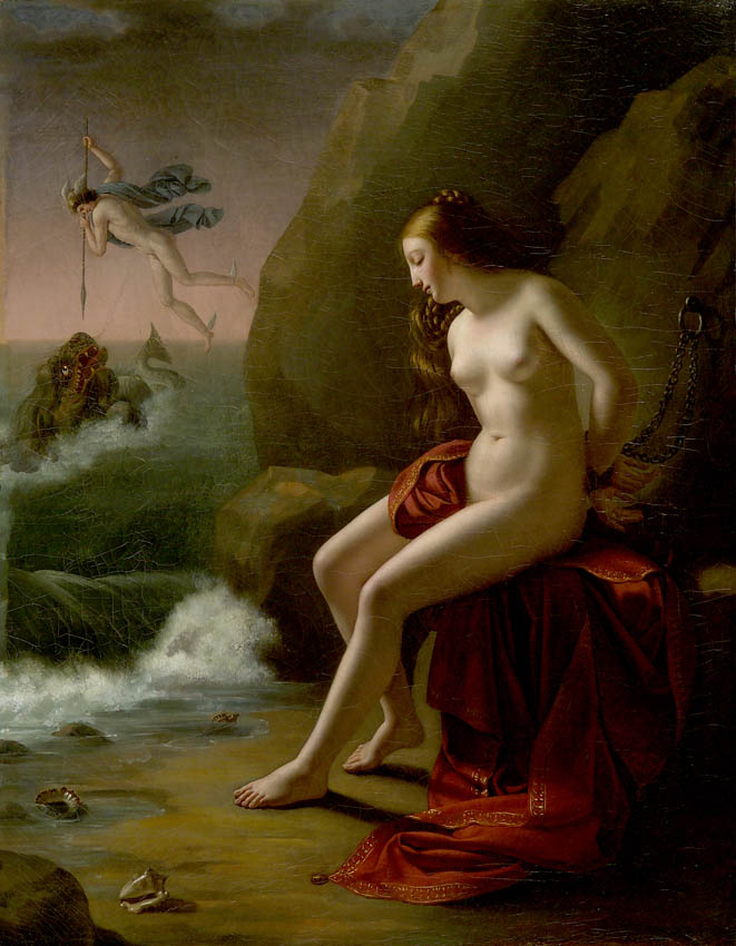 Notre tableau représente une célèbre scène mythologique illustrant un épisode des Métamorphoses d’Ovide. Il a choisi le moment le plus dramatique du récit : il s’agit en effet de la scène où Andromède est la proie du monstre marin. On la voit enchainée à un rocher battu par des vagues furieuses et livrée à un monstre marin. Elle a la tête baissée et parait