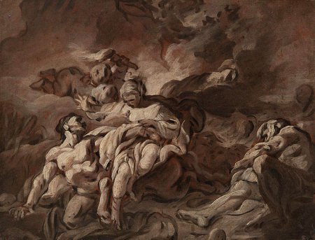 Deshays travaille ici par contraste de valeurs, mariant le blanc et la terre d’ombre naturelle. La préparation rouge, perceptible, confère à ses ombres une tonalité chaude. L’artiste ne s’attarde pas à distinguer précisément les formes ; l’aspect allusif des motifs privilégie une lecture d’ensemble, et en souligne l’effet décoratif. Les figures en torsion des tritons, noueuses, musculeuses, évoquent celles de l’esquisse pour le Cadavre d’Hector exposé sur les rives du Scamandre (non loc.). Les deux putti se retrouvent par exemple dans le ciel du Pygmalion voyant sa statue animée (Musée des Beaux-Arts de Tours) ; leur disposition, jouant dans la vasque, cite directement certaines planches des Recueils de Fontaines de Boucher.