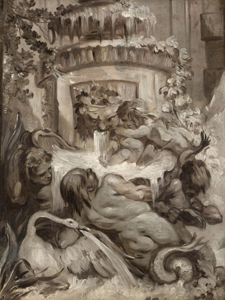 Familier des esquisses en grisaille, Deshays offre ici encore une touche vigoureuse et énergique, plus contrastée que celle de Boucher, au service d’une composition en mouvement. La fontaine est formée d’un socle dont l’eau s’échappe par un masque de grotesque. Elle ruisselle sur une coquille soutenue par trois tritons, avant de ressurgir du bec d’un cygne au long cou incurvé. Deux putti s’ébattent dans la coquille. On peut déceler dans ce travail l’influence d’artistes italiens comme le Bernin ou Borromini, dont Deshays dut voir et dessiner les fontaines à Rome entre 1754 et 1757.