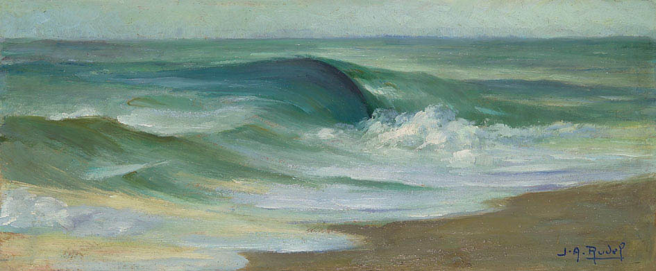 Le tableau, habité en relief par un amas de petits grains de sable enkystés dans la couche picturale séchée sur le motif, s’étire au gré d’une mer paisiblement languedocienne. La vague s’épuise, s’enroule autour d’une écume bouillonnante et blanche. Sable ocre foncé, accompagné de transparences imperceptibles de mauve teinté de lilas, phénomènes chromatiques relevant d’un ressac délicatement coloré, eau verte et turquoise exhaussée d’un bleu plus aigu au sommet du rouleau : harmonie de couleurs tant de fois convoquées par Rudel pour célébrer les plaisirs de la mer et des baigneuses du bel été héraultais. Désir de recueillir l’énergie de ces bruissements maritimes et de ces figures féminines afin de célébrer la vie, quand le fracas des armes de la guerre s’éloigne. À Palavas, vers 1920, sous son parasol, un artiste, un homme se reconstruisait, célébrant mois après mois un nécessaire hymne à la vie, à ses petits bonheurs évanescents et aux beautés simples et légères de l’existence.