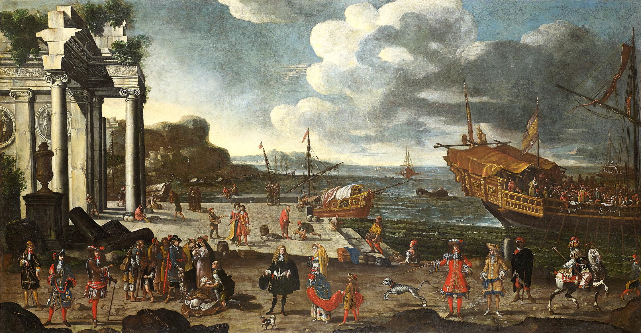 Les personnages principaux, probablement issus du navire, sont repérables à la richesse de leur vêtement, rouge et bleu, brodé d’or, orné de brocards et de galons. L’homme au costume princier est présenté de face ; il porte un chapeau à plumeau, et une canne qu’il pointe en direction de sa femme. Celle-ci, dont un jeune page porte la traîne, est figurée de profil au centre du tableau, le visage retourné vers le spectateur ; elle tient une marguerite dans la main droite. Des hommes en riches costumes de cours, des marchands, des membres d’équipage, des vagabonds, et divers animaux, complètent ce premier plan animé. Le personnage oriental, monté sur un cheval richement harnaché, rappelle ceux qui figurent sur une Bataille Navale de Heinz (voire D’Anza, 2004) ; il y relate l’une des étapes de la longue confrontation qui opposa les Turcs à Venise, jusqu’à la reddition de cette dernière en 1669.