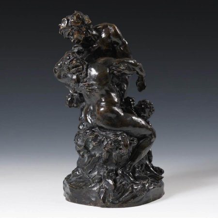 Dalou ne fit éditer qu’un nombre infime d’œuvres de son vivant, mais envisagea plus sérieusement l’édition à la fin de sa vie, afin d’assurer la subsistance de sa fille. C’est ainsi que vers 1890, il réalisa un bronze intitulé Nymphe et Faune ou Le Baiser à la demande du joaillier Henri Vever. Une terre cuite très aboutie est conservée au Petit Palais, parmi les autres œuvres de l’artiste léguées à sa fille. Notre bronze est issu d’une esquisse très libre non localisée aujourd’hui. Il s’agit par ailleurs d’une fonte Valsuani, alors que les contrats d’édition initiés par les héritiers de l’artiste dès sa disparition en 1903 étaient signés avec Hébrard et Susse. Sur les douze exemplaires fondus par Valsuani probablement dès avant la mort de Dalou et à son initiative, deux seulement sont connus : celui que nous présentons, numéroté 3, et celui numéroté 1, en mains privées.