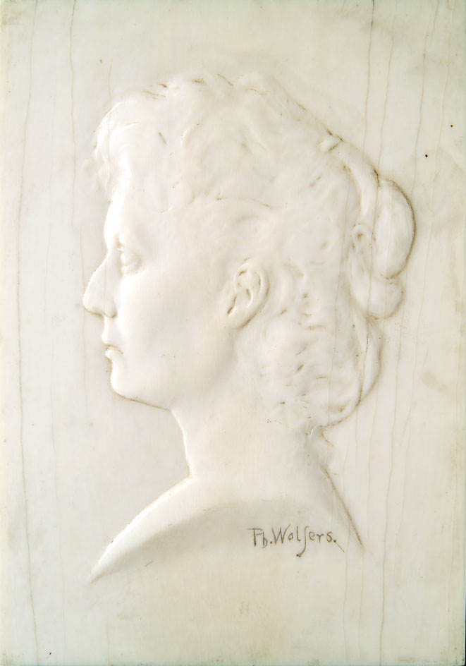 Plaque d’ivoire en bas-relief. Signée sous le buste vers la droite.