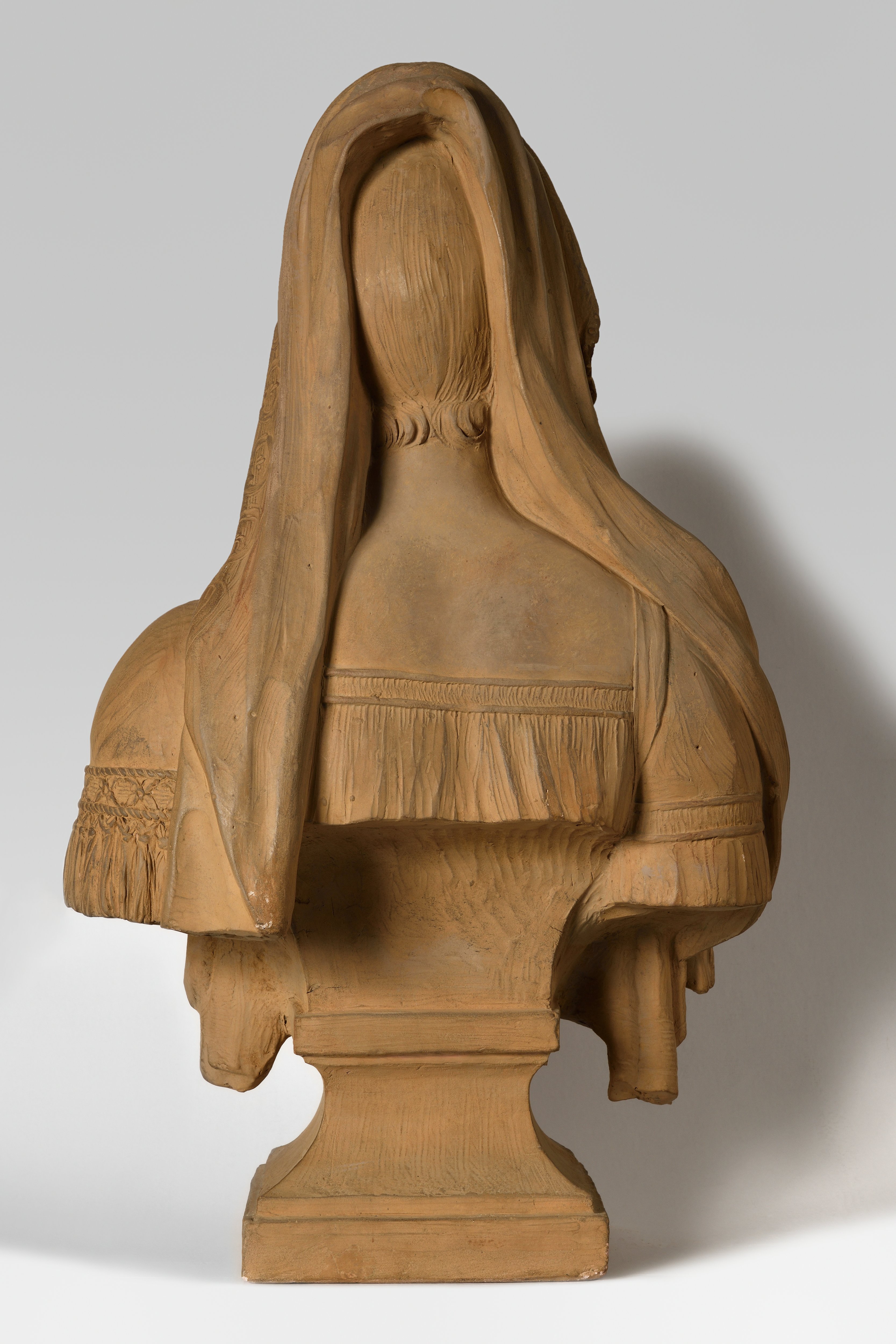 L’identification de notre œuvre est attachée à une autre version du buste, conservé au Musée Cognacq-Jay. Autrefois dans la collection Penha-Longa, il fut exposé au Pavillon de Marsan en 1909 – 1910 sous le titre « Buste de jeune femme coiffée d’un voile étoilé ». Il fut associé à Juliette Récamier en 1911, lors de la vente de la collection à la Galerie Georges Petit. Germain Bapst, qui préfaçait le catalogue, écrivit alors : « En 1805, quand Chinard vint à Paris, il habite chez les Récamier, rue Basse-du-Rempart et se fait adresser son courrier chez eux. Pendant ce séjour, Chinard exécuta un nouveau buste de son modèle préféré dont M. de Penha-Longa possède l’esquisse en terre cuite et le plâtre original ». De multiples détails différencient notre version de celle de Cognacq-Jay : le voile étoilé devient lisse, mais le galon qui le borde s’élargit, et s’enrichit de perles et de palmettes. Celui qui couvre la poitrine s’encadre de deux fines torsades.