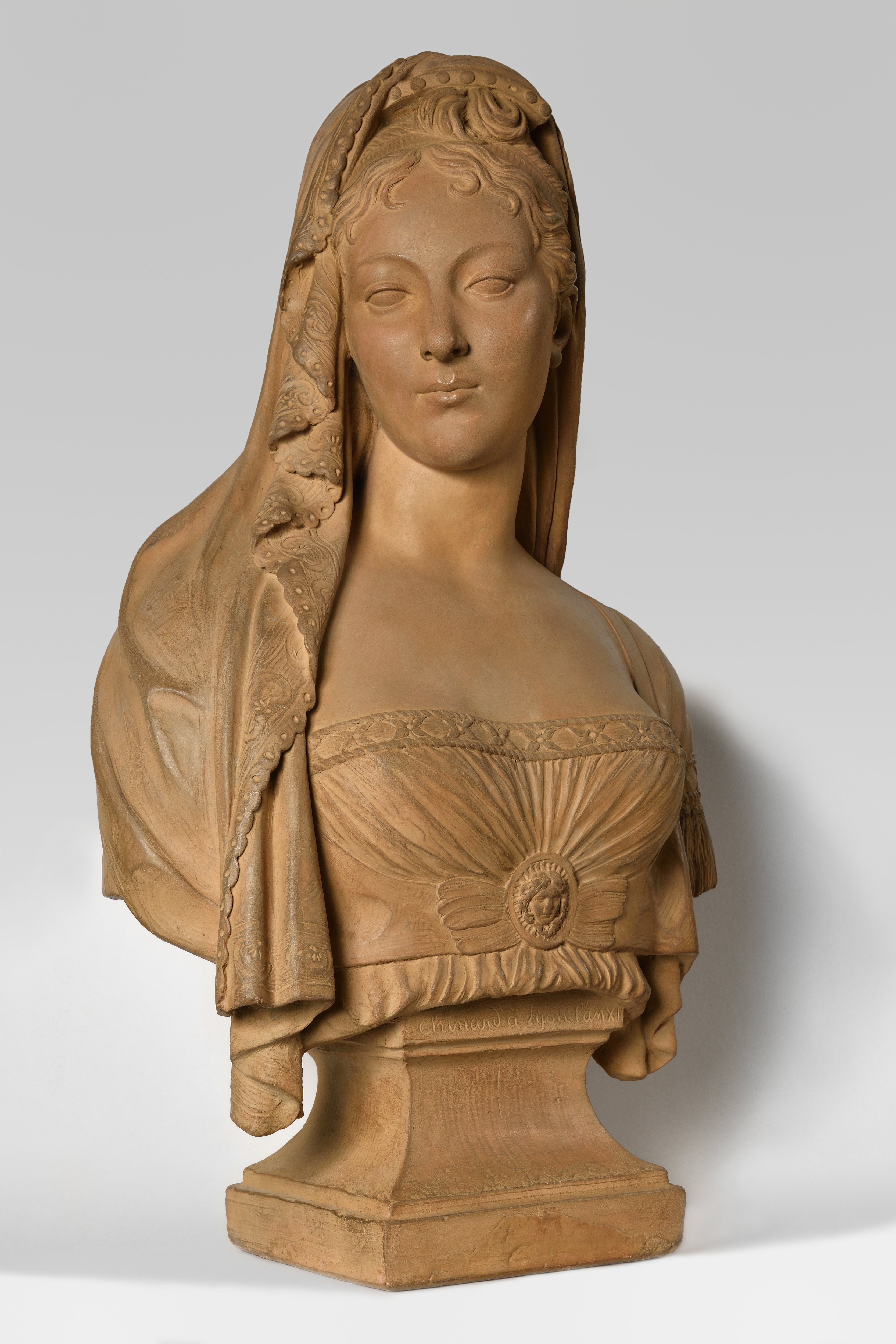 Aussi habile dans le travail du marbre que dans celui de la terre, avec une abondante production de médaillons et de petits groupes, Chinard s’impose comme l’un des meilleurs sculpteurs de son temps, comme le prouvent les nombreuses versions du portrait en buste de Juliette Récamier. Son visage intègre des canons chers à l’artiste : le menton ovale, les yeux en amande et les pommettes rehaussées se retrouvent par exemple dans le Portrait de femme conservé au Musée du Louvre (1802). Si le sculpteur tend à idéaliser la physionomie de ses modèles – ce qui ne facilite pas leur identification – il se plaît toutefois à soigner l’originalité de leurs parures. Son environnement familial n’y est certainement pas étranger : Chinard est le fils d’un marchand d’étoffes, et a épousé une brodeuse.