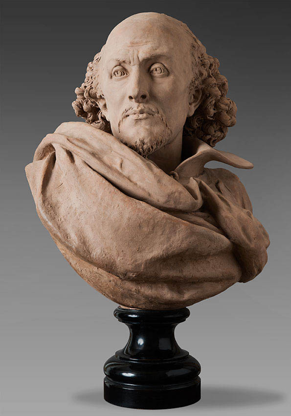 Si Carrier-Belleuse prit goût à dépeindre la société féminine, par des portraits nominatifs ou de charmantes allégories, il exécuta également une série de portraits masculins qui manifestent son attachement aux maîtres anciens, et les origines de son inspiration. On croise dans ce panthéon personnel Virgile et Dante, Raphaël et Rembrandt, Dürer ou encore Beethoven. Les catalogues des ventes Carrier-Belleuse des années 1870, et celui de la vente après-décès de l’artiste en décembre 1887, nous renseignent sur la teneur de ce travail. C’est dans ce dernier que l’on retrouve, parmi les bustes historiques inédits en terre-cuite, la présence de Shakespeare. Le numéro 176 présente en effet l’image du dramaturge, adjugé pour 71 francs (H : 65 cm). C’est ce modèle que mentionne Lami dans son Dictionnaire des sculpteurs de l’Ecole française (1914).