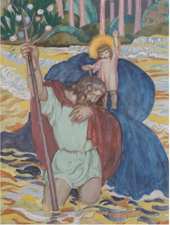 Here, Maurice Denis has created an extremely modern contemplative icon. Far removed from ethereal pious images, Saint Christopher bears himself like a man of flesh and blood, while the young Jesus certainly has assumed the features of one of the artist’s children. Comparing our Saint Christopher with Denis’ first religious images, one can detect the path taken by a man whose spiritual sensitivity ripened in relation to his artistic development. His art remained free of conventions and independent of fashions, so that he inscribed religious registers into contemporary existence without ever denying the esthetic which inspired him to write in 1910: “To remember that a picture, before being a war horse, a nude woman, or whatever anecdote, is essentially a planar surface covered with colors assembled in a certain order.”