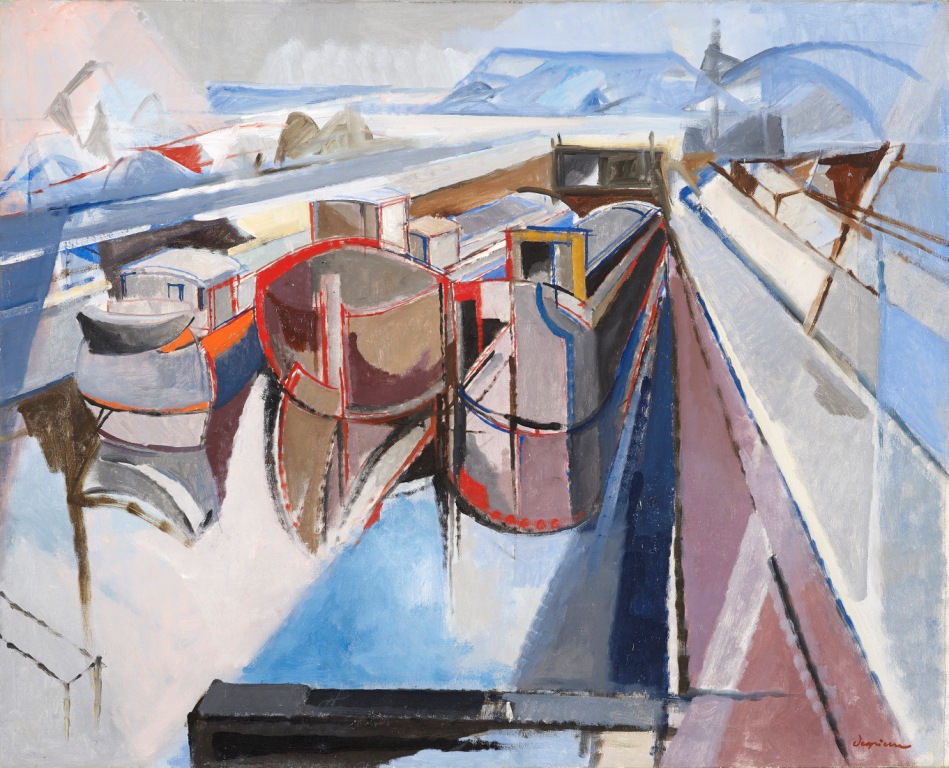 Water occupied an essential place in Jacques Despierre’s oeuvre: “Water seems to me like a moving image of our future, running in a well determined direction in relation to fixed reference points.” The artist’s two points of reference were the Loire and the Seine. While he did series of contemplative, sometimes lascivious, landscapes of the former, he sought human presence through fluvial activitity in the second, from Triel like Marquet or at Vétheuil where Monet had painted. Despierre filled his pictures with barges and was fond of the passage through locks in foreshortened compositions where the barges were shown head-on, as in the image of the Lock (1960) (in Jacques Despierre à la monnaie de Paris, fig. 26).