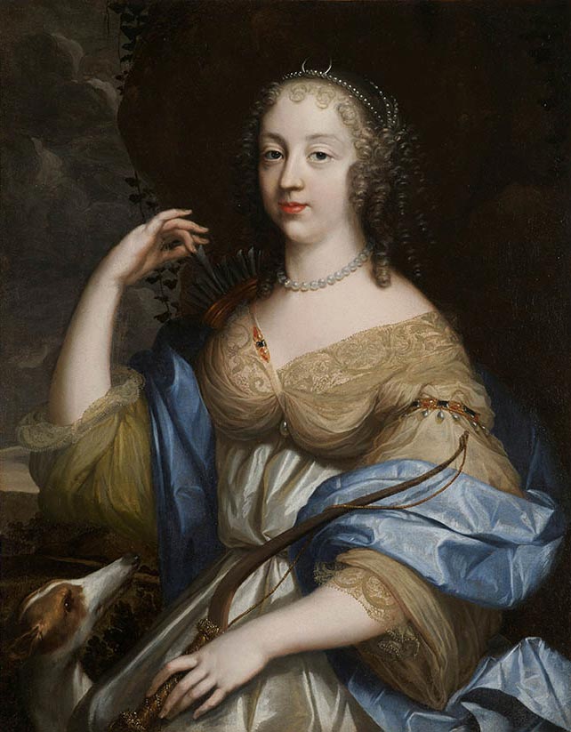 As opposed to the Bussy-Rabutin picture, our portrait bears no inscription, but the name of the salon hostess has been associated with it for a long time. In particular, on the verso of the canvas can be found the date of 1655, which is that of Marguerite Hessein’s marriage, as well Louis Elle the Elder’s signature, the most sought after portraitist of the time. The features of the lady depicted here as Diana the Huntress correspond perfectly to the 1678 literary description: her eyes are greyish blue and her hair - as well as her eyebrows - are a luminous ash blond. The blondness of the blouse and its matching fine lace trim, along with the dazzling white of the pearls in the young woman’s hair and around her neck, beautifully echo this very particular tint of her hair.