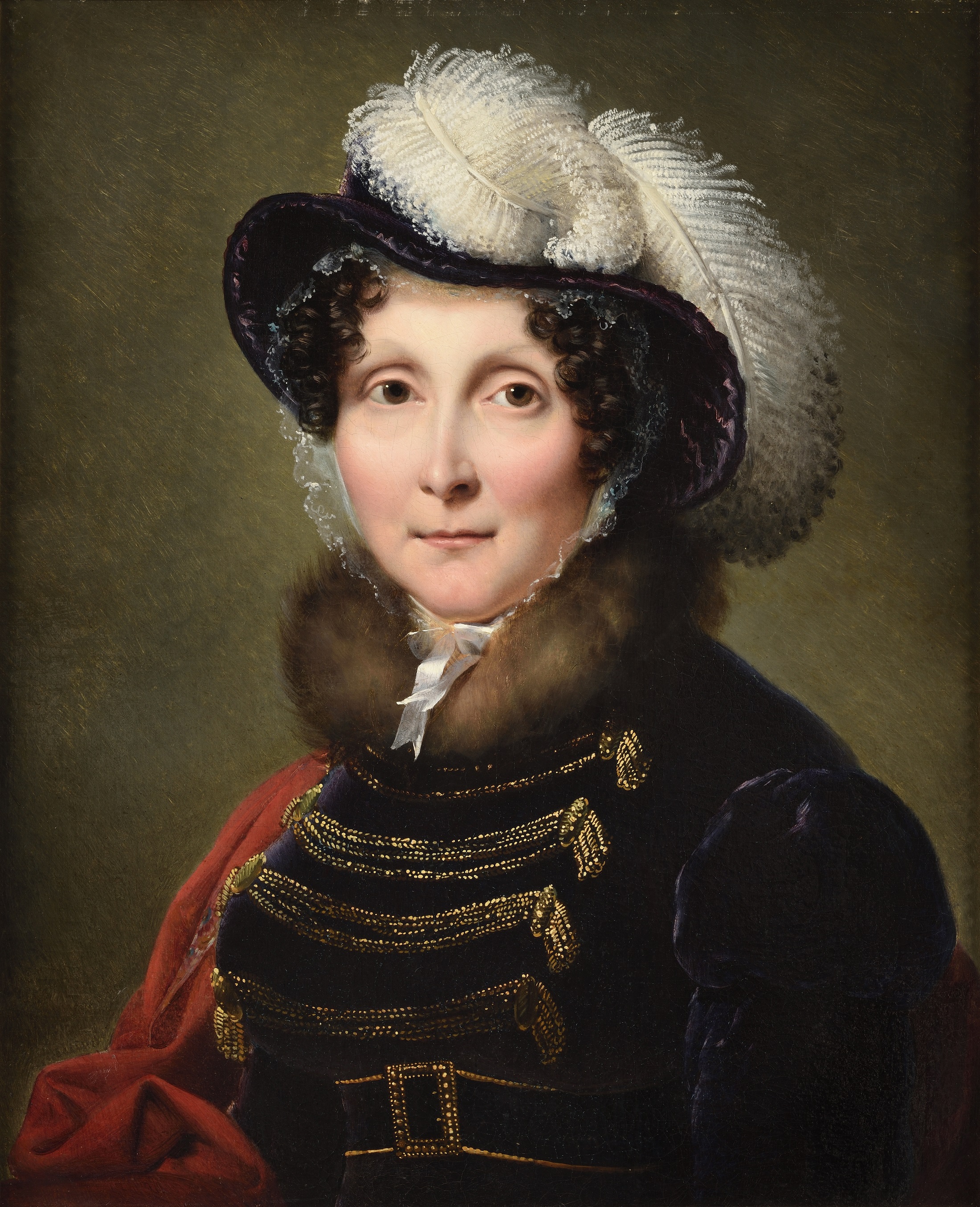 Kinson was the painter of a more and more powerful bourgeoisie who benefited from the post-Revolutionary period and sought, in depictions of self, the reflection of their social condition. Our picture illustrates this demand and presents one of these women in her privacy wearing indoor attire. Against a plainly brushed background, she is seen half-length, slightly turned three-quarters, and with a calm appeasing gaze, looks at the viewer. Her clothing illustrates 1820 to 1825 fashion: beneath a red shawl draped over her right shoulder, a belt under her bosom binds her black velvet dress with its embroidered gold frogging. Her face is elegantly brought out by a black velvet and lace hood embellished with white plumes, typical of the Restoration period and delicately tied with a ribbon under the chin.