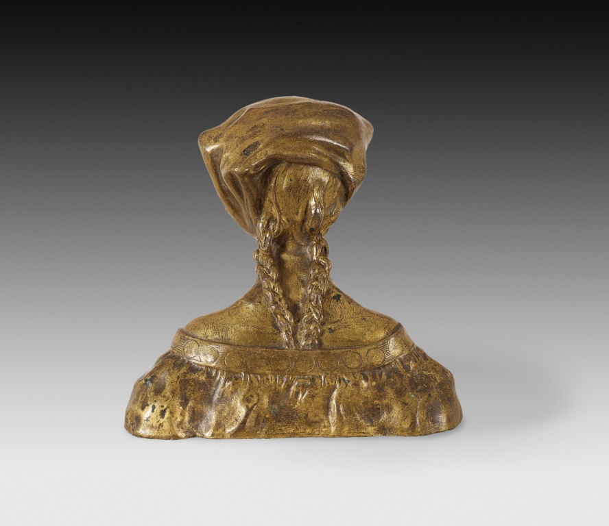 Our little bust dates to the beginning of Suzanne Bizard’s career which was marked by turn of the century decorative Symbolist pursuits. Nonetheless, the monumental nudes and our mysterious little princess with her lowered eyes, richly embroidered robes, and sophisticated headdress had certain qualities in common. Not only was the artist fascinated with both subjects, but in her own way, the medieval lady is quite sensual and her face bears some resemblance to that of Honor. Tirelessly, Bizard returned to princess again and again, sculpting her in bronze, alabaster, marble, and mixed techniques, such as ivory and bronze, alabaster and marble even ass he was to be indefatigable in her work on the monumental nudes.