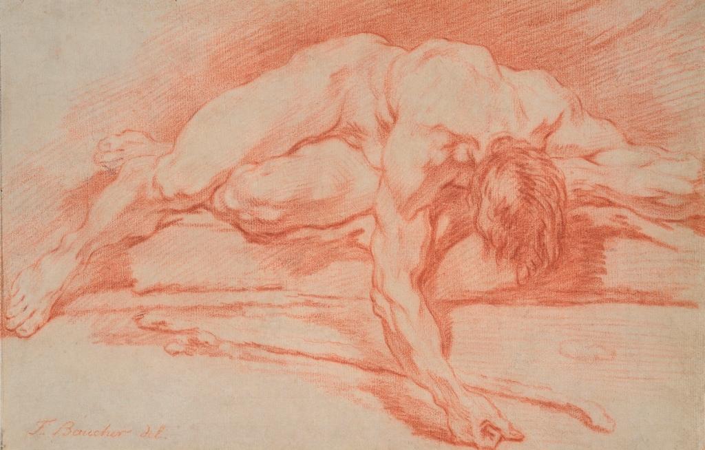Entré à l’Académie royale à la fin de 1734, devenu adjoint à professeur dès 1735 puis professeur en 1737, François Boucher rompt en effet autour de 1740 avec l’enseignement traditionnel, qui modèle le corps depuis l’extérieur par petits traits ronds. Il adopte dans les dessins qu’il livre à ses élèves de l’Académie royale une écriture à grands traits associés à la lumière qui joue sur le corps par pans, de manière presque sculpturale. Cette technique forge un style propre, très expressif qui donne à ses académies de la maturité une puissance unique.