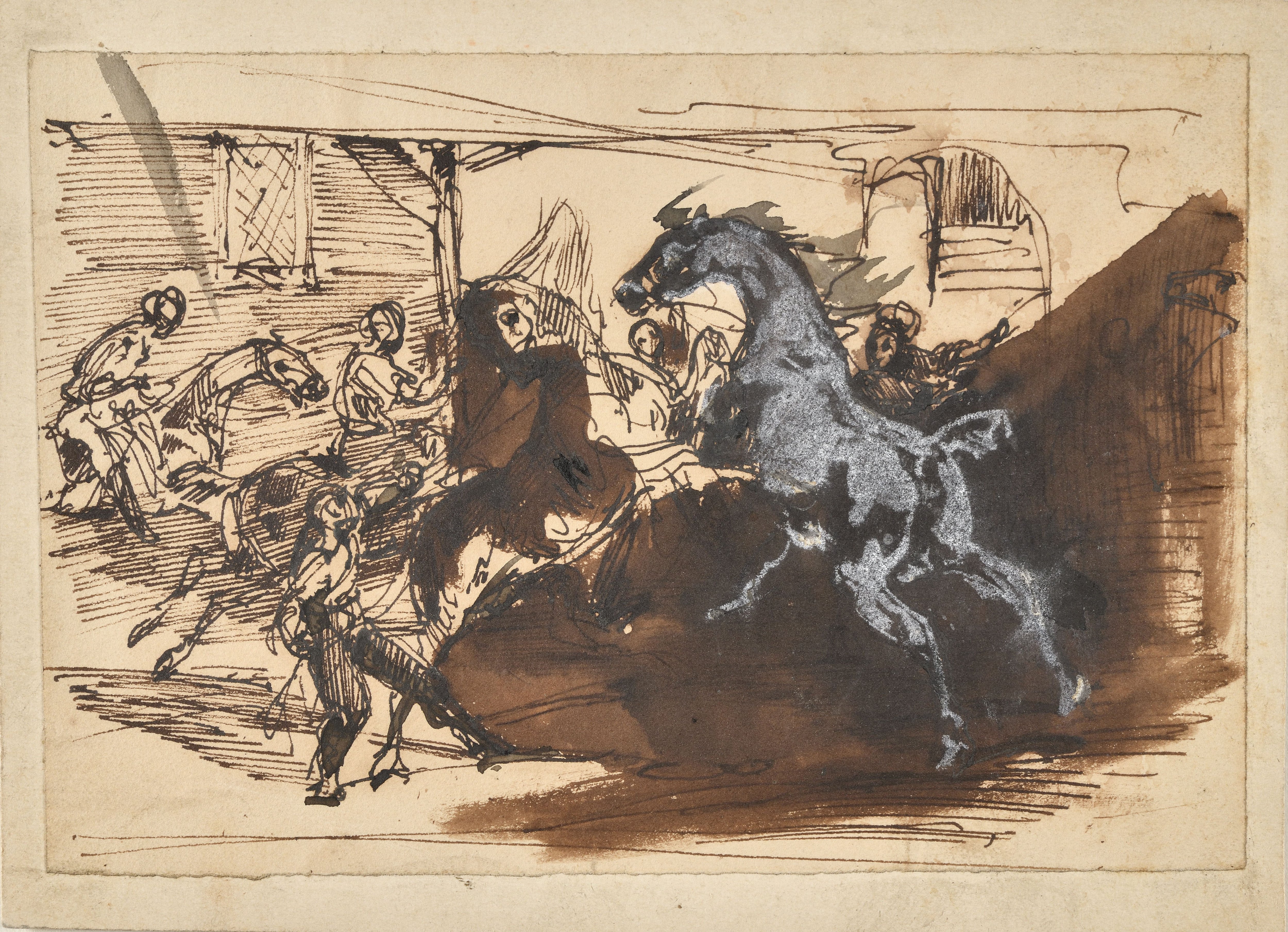 L’énergie et la force animale presque oppressante est traduite d’une part par l’utilisation du lavis brun qui accentue les ombres, et d’autre part par l’utilisation ingénieuse de la gouache blanche qui met en exergue la musculature du cheval à droite comme élément dominant de la composition. Dans cette veine romantique inspirée par Géricault, Vernet illustre ainsi la domination de l’animal et plus largement de la nature sauvage sur l’homme et exacerbe cette puissance incontrôlable. On peut aisément penser que Vernet, tout comme Géricault, réalisa cette œuvre en Italie après avoir assisté à cette fête populaire appelée le Carnaval de Rome, durant lequel avaient lieu des parades dans les rues allant de la Place du Peuple à la Place de Venise et des courses de chevaux sur le fameux Corso.