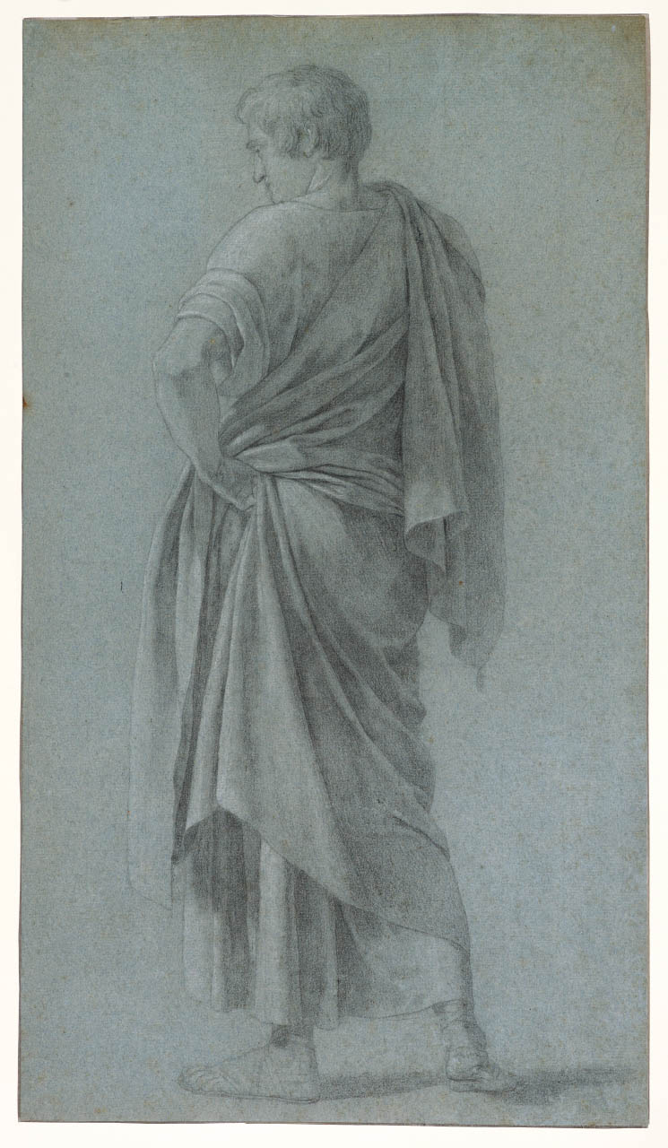 Suvée dessine ici des personnages monumentaux, dans la lignée de l’esthétique classique. La ligne est pure, soulignée d’un fin clair-obscur sublimé par le bleu du papier vergé. Le modelé des drapés, précisément travaillé, évoque celui des bas-reliefs antiques. Bien que réalisés en vue d’un tableau, les deux dessins ont un caractère achevé. Leur orientation est d’ailleurs différente dans la peinture : les profils sont modifiés, et le bras droit du jeune homme apparaît. Les figures seront en outre partiellement tronquées pour être intégrées à la composition.
