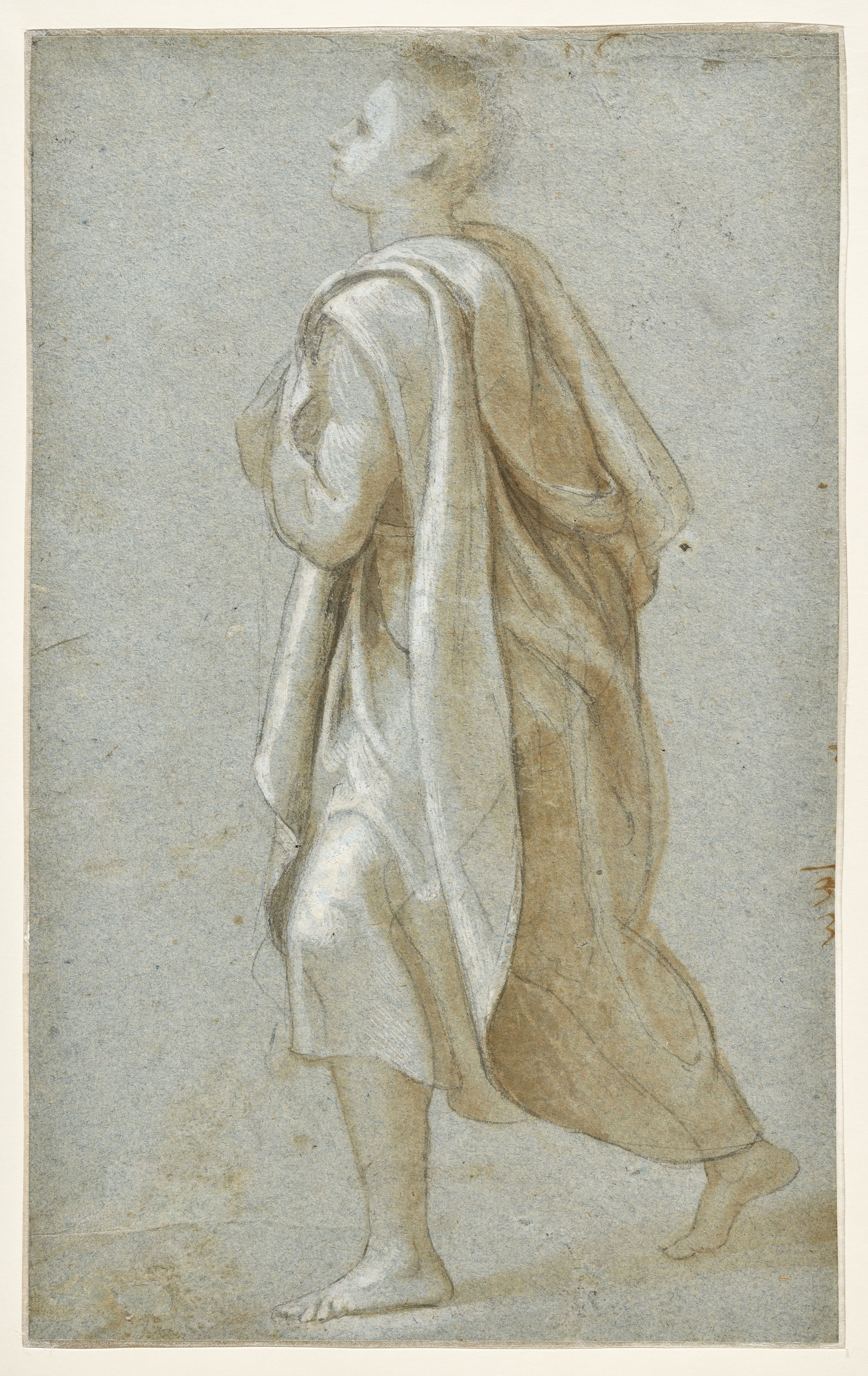 Notre dessin dévoile également la capacité de l’artiste à rendre la lumière. La tête légèrement relevée, la figure tourne le regard vers le haut, comme fortement attirée par une lumière émanant de la gauche. L’espace est habilement formulé par l’ombre portée des pieds qui s’avancent vers la gauche. Enfin, par une utilisation limitée de médiums, Lomazzo parvient à colorer son œuvre tout en traitant les volumes : la pierre noire délimite la forme tandis que l’encre et le lavis brun accentuent les volumes du drapé retombant dans le dos de la figure.