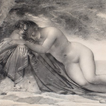 Plus ou moins aboutis, les dessins devaient vraisemblablement préparer les lithographies destinées à illustrer la traduction de Musée par l’artiste. Toutefois, seule notre composition fut gravée en 1820 par Joseph Dassy, élève de Girodet. Celui-ci y apporta de nombreuses modifications, ne gardant que la pose des deux protagonistes. Tout porte cependant à croire que la datation proposée par Coupin est exacte et que notre étude soit antérieure à 1814, année où Pierre-Claude Delorme, lui aussi disciple de Girodet, présenta au Salon (hors livret) une grande huile sur toile sur le même sujet.