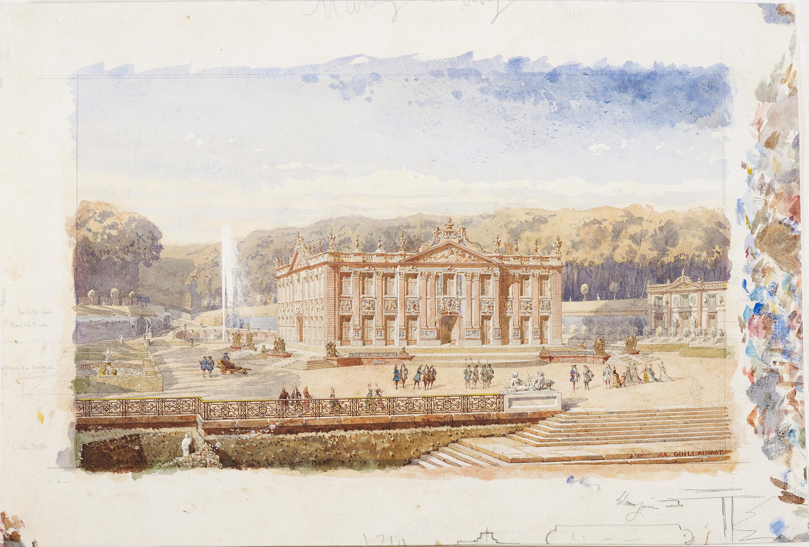Le second dessin, représente a contrario l’aboutissement de plusieurs années de recherches méticuleuses dans les archives, de relevés, de fouilles et de réflexions. Il paraît contemporain de l’aquarelle intitulée L’Abreuvoir en 1700 datée de 1876 et exposée au Salon de 1878 (collection particulière, 57,5 x 97 cm). Plus ambitieuse, notre œuvre offre un point de vue inédit sur le pavillon royal et s’emploie à restituer les bâtiments dont seules quelques fondations subsistent, mais également les décors sculptés, les grilles, les bosquets, les pavillons et la statuaire du parc. Le dessinateur se donna une date de 1710, soit la fin du règne de Louis XIV, afin de présenter les bassins des Carpes réalisés à partir de cette date d’après une idée de Pierre Lepautre et recouverts de carreaux de faïence dont Guillaumot avait découvert l’ornement lors de ses propres fouilles dans les années 1860-1870. La perspective est construite à la sanguine, mais surtout au crayon. L’ensemble est ensuite travaillé à l’aquarelle et à la gouache qui rehausse les dorures, les marbres et les jets d’eau. L’artiste s’amuse à peupler les lieux de courtisans vêtus avec grande exactitude – en 1875, Guillaumot publia un recueil de Costumes au XVIIIe Siècle – et marque la présence du vieux souverain par sa chaise roulante entourée de gardes.