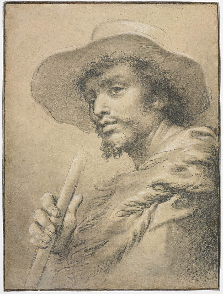 À la même époque, il fournit au graveur Joseph Wagner les dessins pour une série de quatre feuilles qui présente des similitudes frappantes avec notre œuvre. Certes, la composition et la technique tiennent encore beaucoup de Piazzetta, mais le rendu est très différent. Maggiotto cherche à retranscrire l’air autant que la lumière, la matière autant que les formes, le sentiment autant que l’attitude, caractéristiques communes aux autres dessins de l’artiste. Il se sert beaucoup de l’estompe ou, comme dans notre œuvre, du lavis de pierre noire pour adoucir les courbes et atténuer les passages entre les parties éclairées et celles plongées dans l’ombre. Il s’enthousiasme pour la doublure fourrée de la cape, les boucles des cheveux, la courbure du nez, l’éclat du regard, la sensualité des lèvres entrouvertes. Plus que son maître, Maggiotto semble, dans ses figures de fantaisie, vouloir raconter une histoire, leur donner un sens moralisateur ce dont attestent les titres des estampes de Wagner.