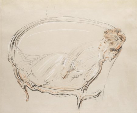 Considéré comme impressionniste par ses pairs, le portraitiste s’intéresse à l’effet d’instantanéité en capturant les expressions de ses modèles sur le vif. « Il était le plus habile, le mieux doué, Manet, Monet, Renoir, le croyaient comme nous ». Pour capturer l’instant, Helleu dessine d’un trait rapide et hâtif, maîtrisant parfaitement la technique dite des trois crayons : le fusain, la sanguine et la craie blanche lui permettent de rendre aisément les surfaces, matières et profondeurs, ici des roses presque roux dans la chevelure du modèle. Dans notre œuvre, la délicatesse du modèle est traduite par des traits amples et généreux enveloppant le modèle par de souples lignes gracieuses. Ses dessins font preuve de joie et de liberté dans la ligne à laquelle il accorde la plus grande importance, en opposition avec le fond évanescent, souvent simplement suggéré.