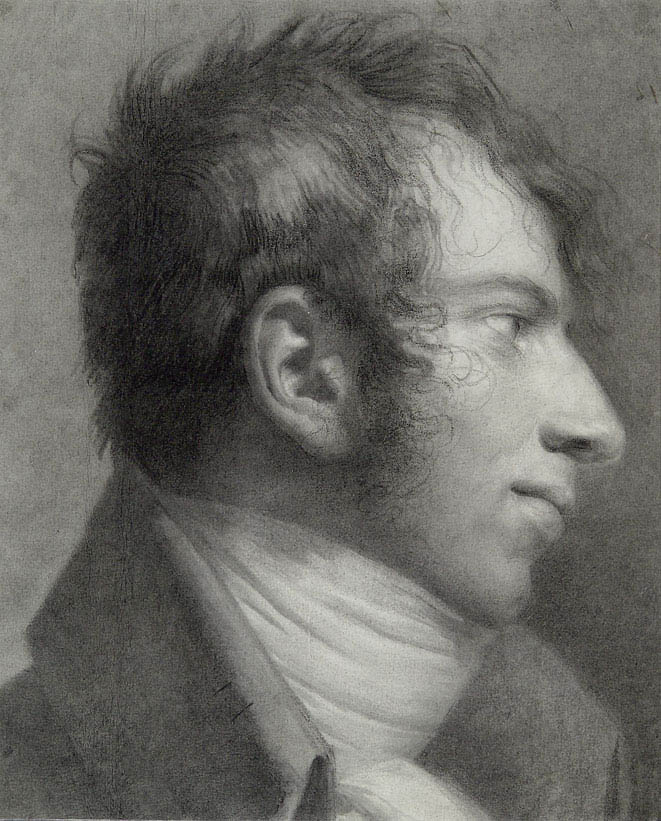 Notre dessin, où l’on perçoit l’influence de David, s’inscrit ;dans la tradition académique des « têtes d’expression ». Dans un cadrage serré, l’homme est figuré de profil droit. Le port de la tête est souligné par la lavallière blanche enserrant le cou, et le large col d’un habit. Le modelé des chairs est doux, l’expression pensive. Le visage est contenu entre les mèches ondulées d’une chevelure libre, précisément dessinée, qui encadre l’oreille et retombe sur le front. Le regard et la physionomie du personnage ne sont pas sans évoquer les traits du peintre.