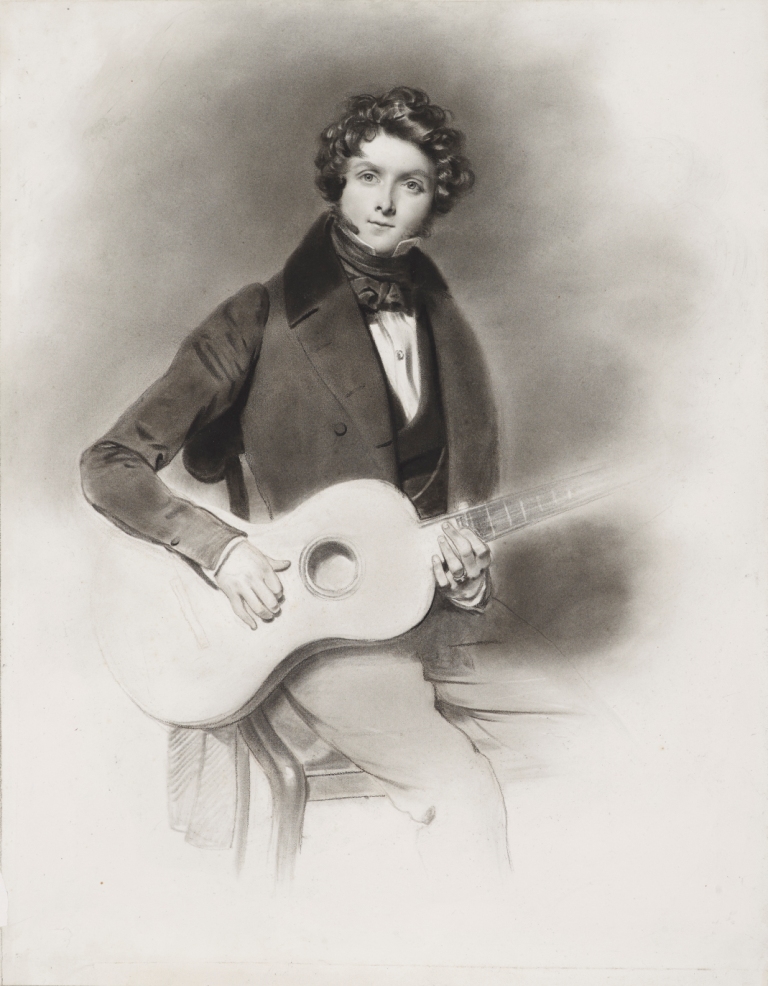 À de multiples reprises, apparait dans le recueil un jeune homme non encore identifié qui figure à gauche de Colin dans la représentation de l’atelier de Girodet. Dans cinq feuilles, on le voit jouer de la guitare (plutôt que de la mandoline), avec bonheur et réelle maîtrise semble-t-il. Les traits de cet artiste-musicien ne sont pas sans rappeler ceux du modèle de notre portrait, vêtu et coiffé à la mode des années 1820. La présentation de notre dessin élégante et technique, avec la partie haute, celle du visage, très soignée, estompée et quasi photographique, et la partie basse, celle de l’assise, au contraire à peine dessinée et hachurée, fait penser aux portraits de musiciens lithographiés par Achille Devéria, ami proche de Colin depuis leur formation chez Girodet. Mais la réalisation en est très différente et se distingue surtout par un travail virtuose de l’estompe qui confère à l’ensemble un côté velouté, rapproche la pierre noire d’un lavis d’aquarelle et remplace les rehauts de blanc dans la chevelure, les yeux ou le bord du col amidonné. On retrouve la même utilisation de l’estompe dans deux dessins de l’artiste datés de 1818, le Portrait d’homme conservé à Orléans et le Portrait de jeune homme en mains privées où Colin appose même sa signature à l’estompe. Quant au regard inspiré et clair de notre jeune et si élégant joueur de guitare, il est aussi celui de Louis-Auguste Lemonnier, chanteur de l’Opéra-Comique, dessiné et gravé par Colin en 1823.