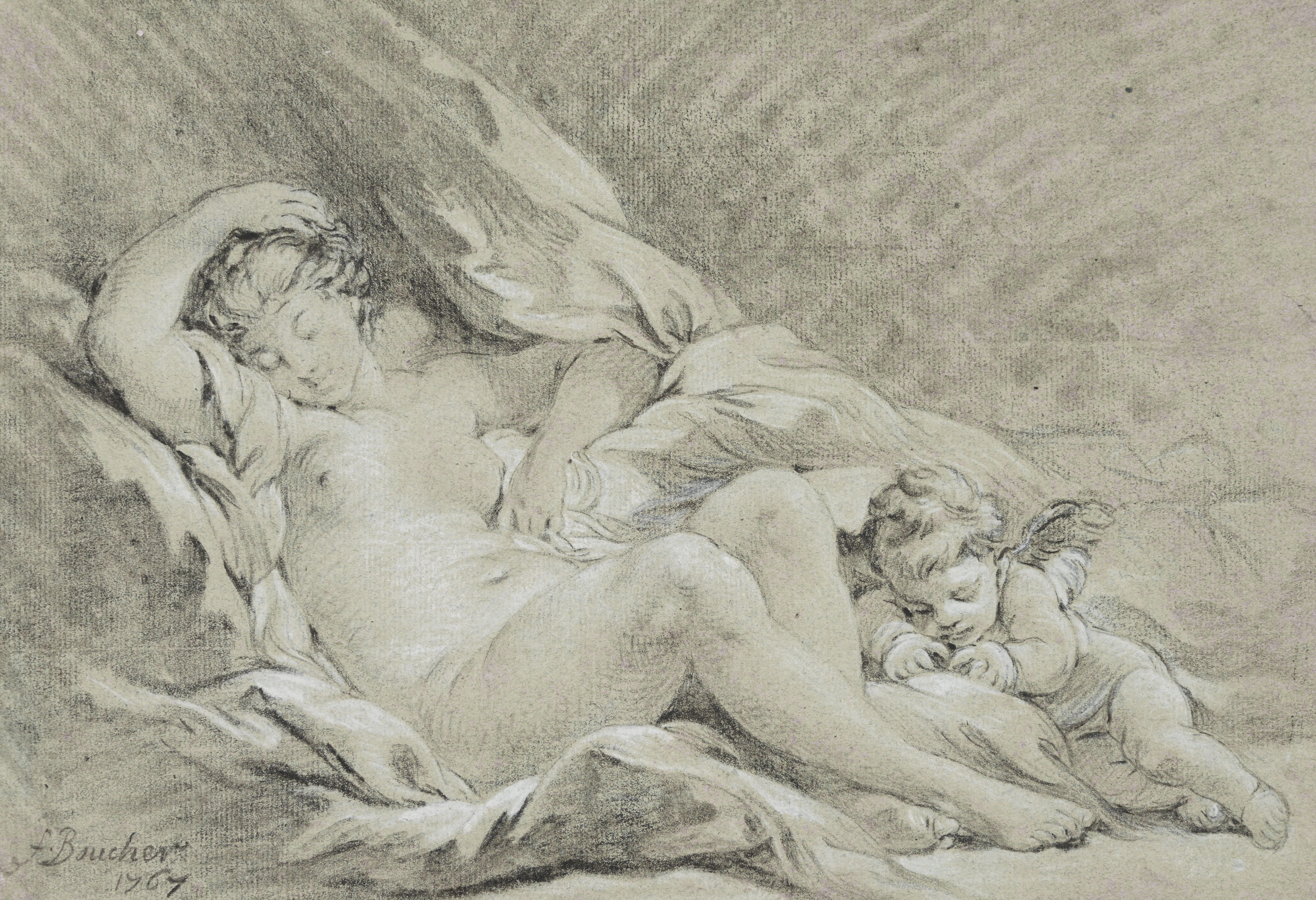 Réalisée trois ans avant la disparition de l’artiste, notre feuille est ainsi l’une des dernières pièces d’une longue série de dessins et de tableaux représentant la déesse de l’Amour : seule Vénus sur les eaux commandée en 1769 par Jean-François Bergeret de Frouville pour son hôtel parisien lui est postérieure (Los Angeles, J. Paul Getty Museum, inv. 71.PA.54). Elle s’inscrit également dans une tradition déjà très ancienne de montrer Vénus dans une attitude langoureuse et étonnamment peu confortable, le bras recourbé au dessus de la tête, et qui tire son origine de l’Ariane endormie du Vatican, découverte en 1512. Identifiée alors comme Cléopâtre, la statue fut rebaptisée Vénus par Heinrich Winckelmann dans son Histoire de l’art de l’Antiquité parue en 1764. Toutefois, les artistes – Titien, Dirk de Quade van Ravesteyn, Annibale Carracci, Luca Giordano, Nicolas Poussin, Eustache Le Sueur, Jacques Blanchard, Sebastiano Ricci ou Antoine Coypel – n’ont pas attendu cette nouvelle hypothèse pour peindre Vénus au repos en s’inspirant du marbre romain, heureux de pouvoir s’appuyer sur une référence antique.