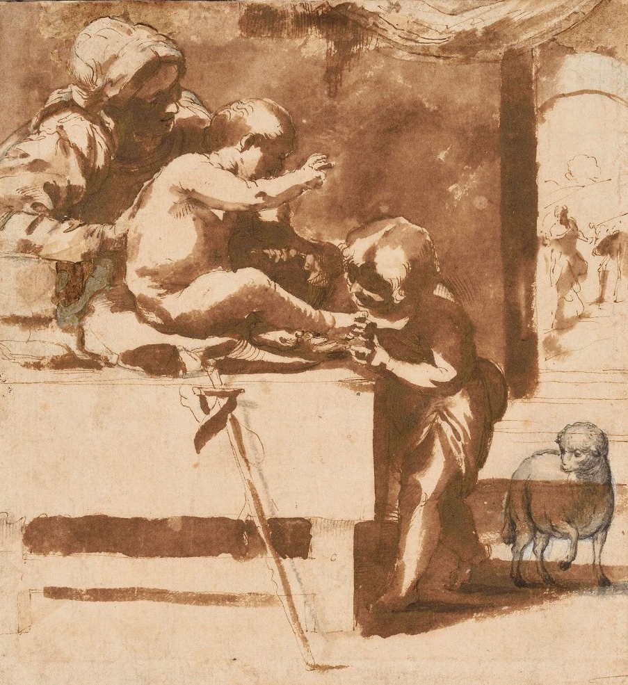 Le thème fut également développé par Reni dans plusieurs peintures connues par les gravures, ainsi que le petit cuivre offert par l’artiste au pape Paul V vers 1606-1607. Cette fois, Marie tient son fils sur les genoux et Saint Jean est accompagné d’un agneau semblable à celui de notre dessin : à l’encre noire et au lavis gris, il est manifestement rajouté postérieurement à la réalisation du croquis et en même temps que l’ombre portée de la croix du Baptiste et quelques touches de lavis gris dans la figure de la Vierge. L’artiste semble se ressouvenir de notre composition aussi tardivement que dans les années 1640 : sa grande Vierge à l’Enfant avec Saint Jean Baptiste conservée au J. Paul Getty Museum reprend ainsi l’organisation pyramidale du groupe de personnages, le drapé et l’idée d’un intérieur sombre s’ouvrant à droite sur la figure de Joseph.