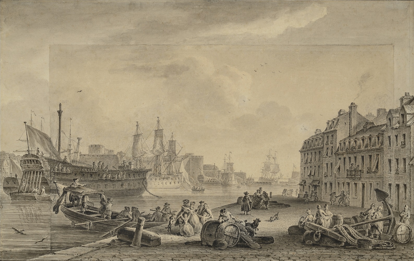 Notre dessin est à rapprocher de la Vue du port de Rouen prise depuis l’amont du fleuve conservée au musée des Beaux-Arts de Rouen et datée de 1792. Non seulement elle possède les dimensions exactes de notre vue de Brest, mais surtout elle est dessinée sur une feuille de papier collée par l’artiste lui-même sur une autre feuille plus grande. Les deux œuvres partagent également la légèreté de la touche, la large place réservée au ciel parcouru de nuages vaporeux et la recherche de narration. Mais si, dans le dessin rouennais, il ne s’agit que d’une promenade agréable, le « sujet » principal de notre lavis, enveloppé d’une douce lumière, est beaucoup plus touchant, car il s’agit d’un retour d’un officier de marine accueilli avec joie par son épouse, ses enfants et son chien.