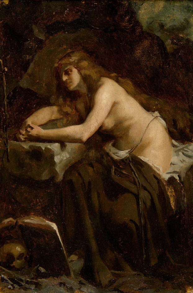Le peintre avait peut-être puisé le thème de Marie-Madeleine chez les maîtres anciens ; les représentations qu’en avaient faites Corrège puis Pompeo Batoni avaient été largement diffusées. On retrouve à plusieurs reprises la sainte dans l’œuvre du maître (voir par exemple ‘La Madeleine lisant’, Paris, Musée du Louvre ; ‘La Madeleine en prière’, vente Sotheby’s, 04/05/2012, lot n° 85). Le buste dénudé, enveloppée d’une, tunique, elle figure en prière, implorante, dans le désert. Accompagnée d’une vanité, elle a souvent le regard élevé vers le ciel. A l’inverse, dans notre œuvre, son visage est tourné vers le crucifix qu’elle semble invoquer, les mains jointes. Ce n’est plus la nature qui entoure la sainte, mais un univers minéral que Corot aimait peindre, et qui l’avait souvent occupé lors de ses séances en forêt de Fontainebleau.