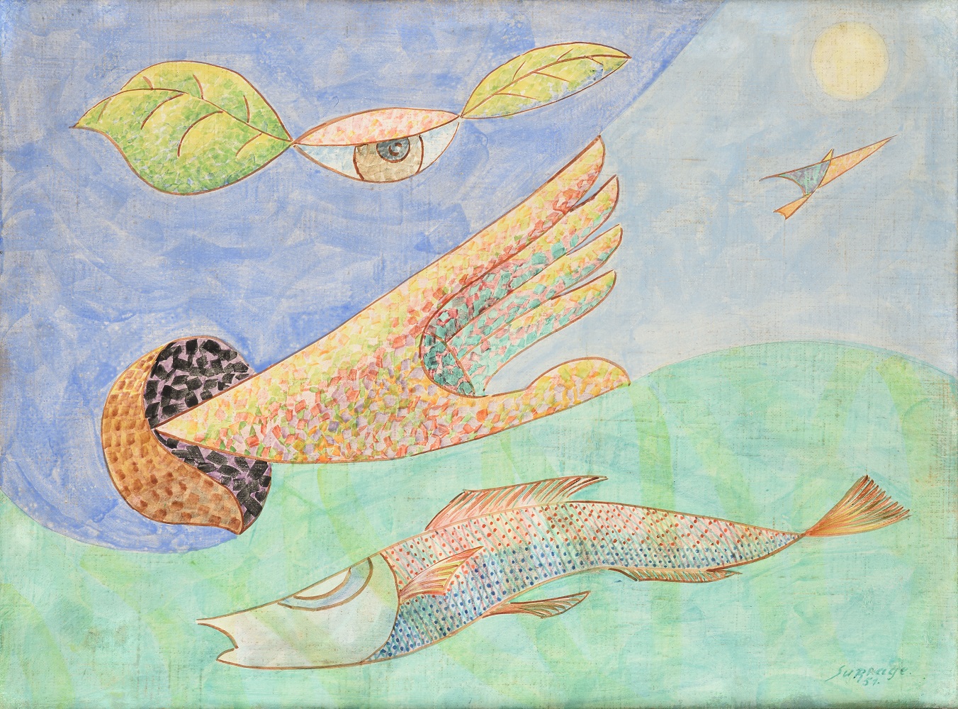 Notre toile participe à la réflexion que mène l’artiste depuis les années 1940 dans ses œuvres graphiques ou peintes sur la symbolique complexe, qu’elle soit chrétienne ou païenne, des objets tels que main, œil, feuille, poisson, maison, oiseau, eau ou soleil. On peut ainsi citer : Feuille, main, poisson de 1951, Mains et poissons de 1953, L’œil et la main de 1949 ou Composition avec main et poisson de 1961. Survage ne cesse de combiner les éléments, de les réunir et de les inscrire les uns dans les autres. Il joue sur les rythmes, les courbes et contrecourbes, sur la juxtaposition des tonalités limpides et complémentaires, sur celle des larges aplats de couleur et des touches caléidoscopiques, ainsi que sur la superposition des couches teintées propre à peinture à la caséine.