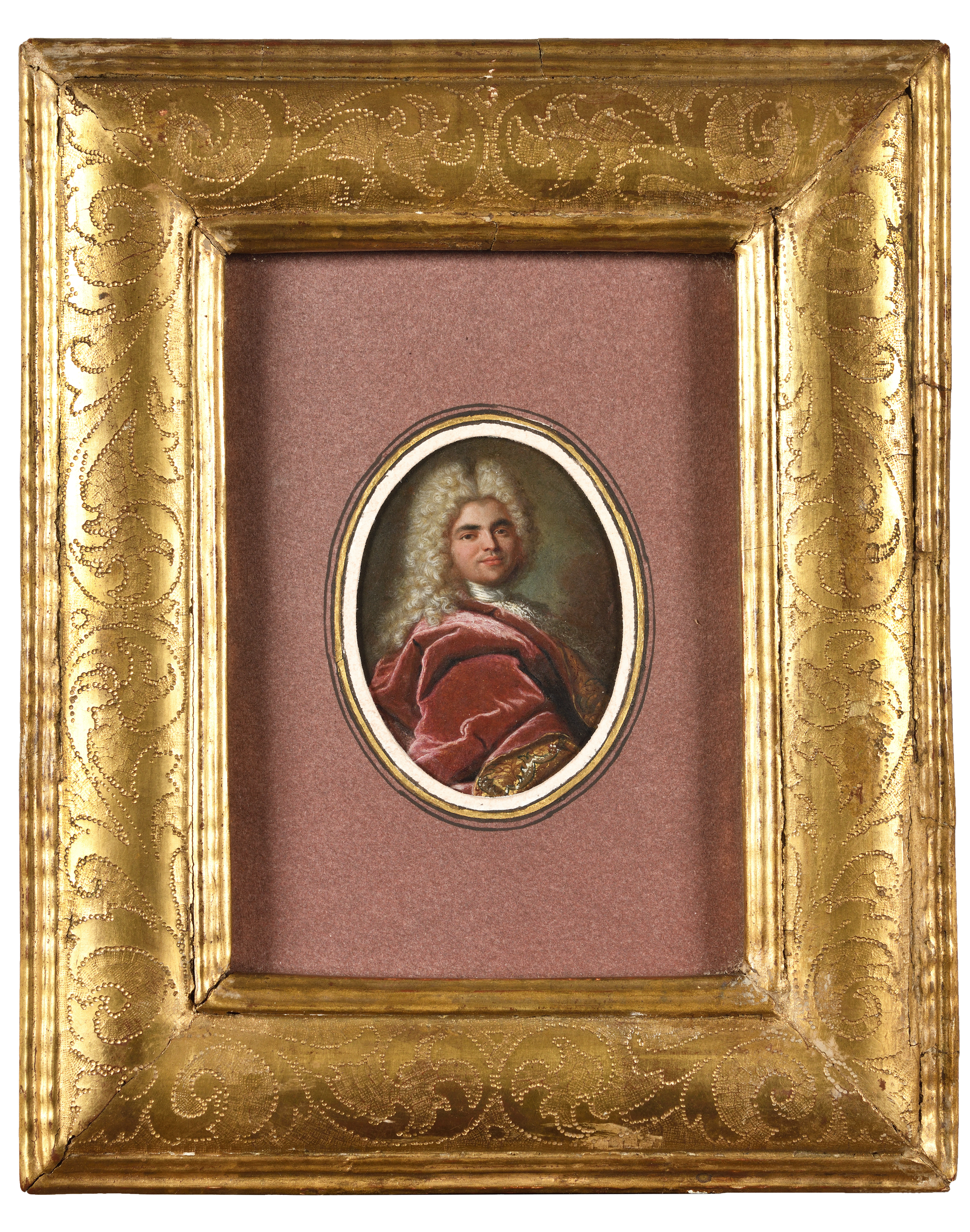 Notre oeuvre est un formidable exemple de cette étroite production, faisant écho à quelques témoignages connus de l’artiste dont un autoportrait et un portrait d’homme récemment ajouté au supplément du catalogue raisonné de son oeuvre. Dans une oeuvre de format n’excédant pas les 7,5 centimètres de hauteur, l’artiste présente un modèle masculin en buste, les épaules tournées vers la droite dont le visage pris de face fixe le regard vers le peintre. La simplicité de la pose et cadrage serré sont deux composants récurrents chez Rigaud. La physionomie du modèle, demeurant à ce jour anonyme, s’exprime par la douceur pénétrante du regard réhaussé d’un léger sourire esquissé. L’homme est vêtu d’une large cape de velours d’un rouge éclatant doublée de soie aux brocarts d’or, de laquelle s’échappe une cravate de dentelle élégamment nouée. Sa perruque peu élevée et recentrée sur le visage ainsi que les plis soigneusement ordonnés et légèrement géométrisés de la cape plaident pour une oeuvre datant de la fin des années 1680.