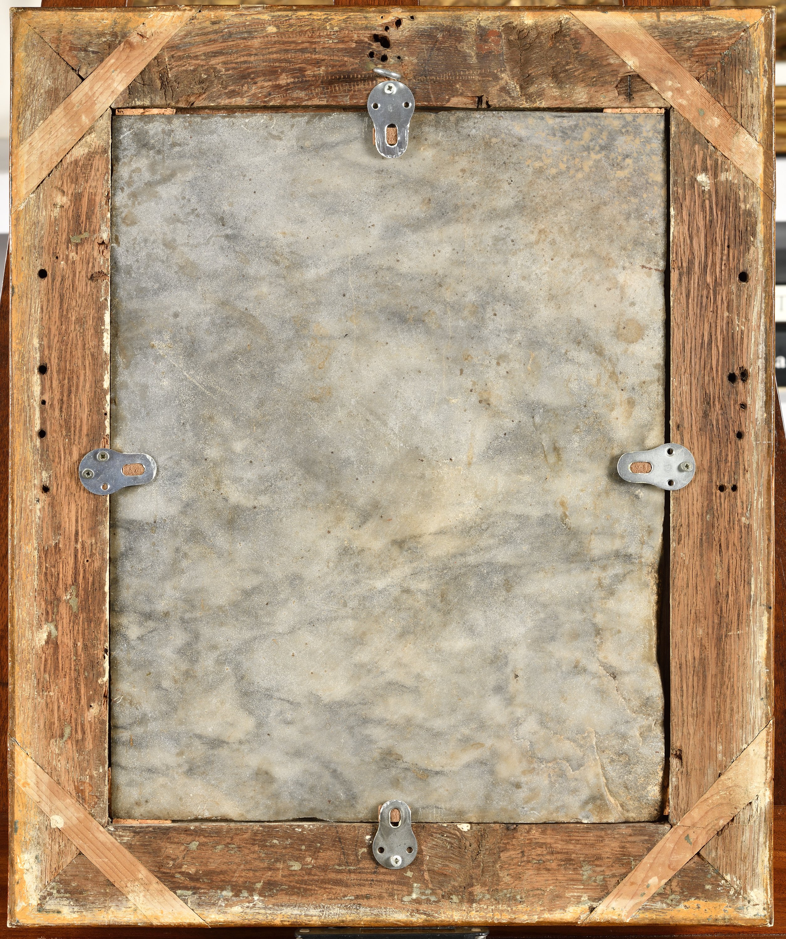 C’est probablement l’influence de Tempesta qui conduisit l’artiste à travailler sur différents supports tels que les pierres dures. Dans cette image héroïque, Déruet choisit un marbre gris laissé en réserve permettant d’apprécier la qualité esthétique de la pierre soigneusement sélectionnée pour ses veines apparentes prenant ici l’apparence de lourds nuages d’un ciel orageux dompté par le fier monarque.