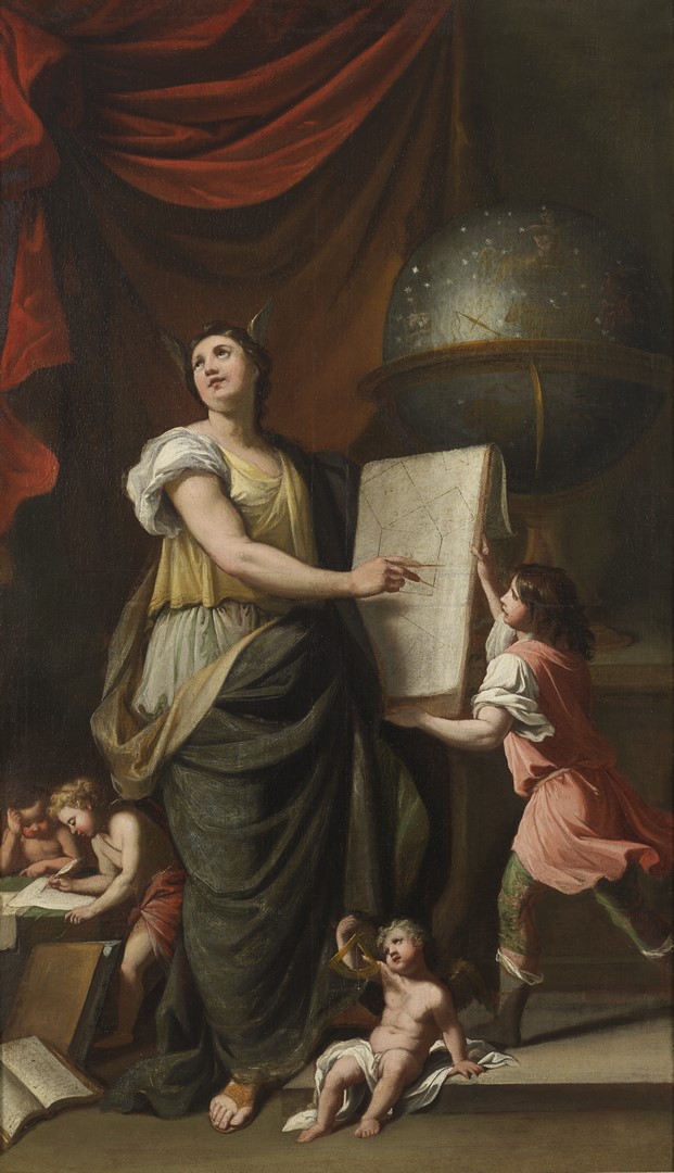 L’Astronomie se tient debout dans un espace délimité par un drapé rouge. Des petites ailes ornent sa tête et sa tunique est jaune clair et bleu nuit. Les yeux levés au ciel, elle mesure avec un compas le carré de Pythagore soutenu par un jeune génie sans ailes. L’arrière-plan est bouché par un grand globe céleste dressé sur un piédestal.