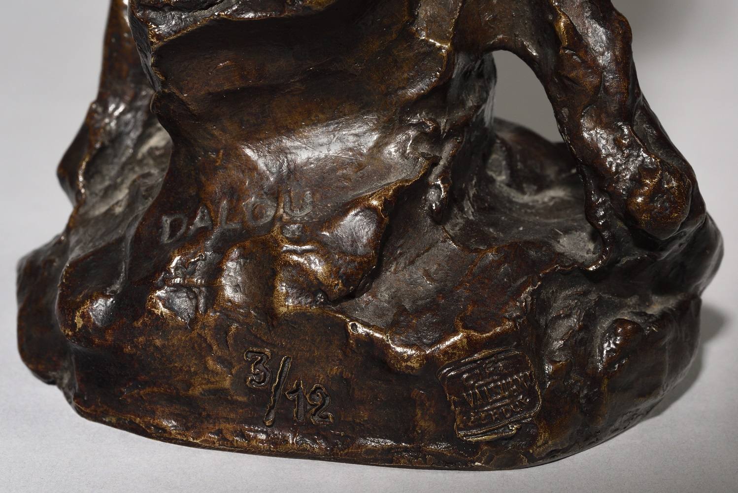 Dalou ne fit éditer qu’un nombre infime d’œuvres de son vivant, mais envisagea plus sérieusement l’édition à la fin de sa vie, afin d’assurer la subsistance de sa fille. C’est ainsi que vers 1890, il réalisa un bronze intitulé Nymphe et Faune ou Le Baiser à la demande du joaillier Henri Vever. Une terre cuite très aboutie est conservée au Petit Palais, parmi les autres œuvres de l’artiste léguées à sa fille. Notre bronze est issu d’une esquisse très libre non localisée aujourd’hui. Il s’agit par ailleurs d’une fonte Valsuani, alors que les contrats d’édition initiés par les héritiers de l’artiste dès sa disparition en 1903 étaient signés avec Hébrard et Susse. Sur les douze exemplaires fondus par Valsuani probablement dès avant la mort de Dalou et à son initiative, deux seulement sont connus : celui que nous présentons, numéroté 3, et celui numéroté 1, en mains privées.