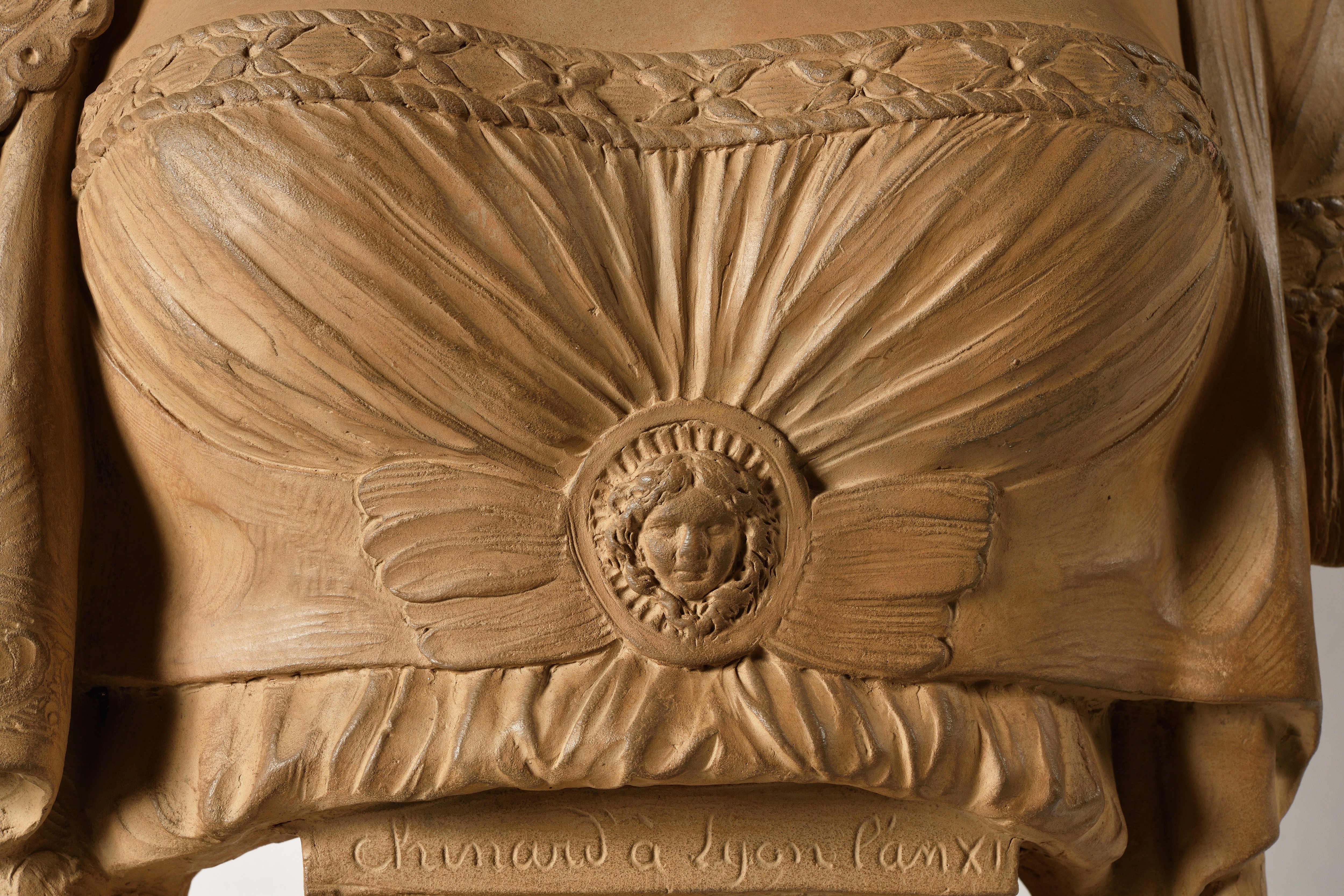 Aussi habile dans le travail du marbre que dans celui de la terre, avec une abondante production de médaillons et de petits groupes, Chinard s’impose comme l’un des meilleurs sculpteurs de son temps, comme le prouvent les nombreuses versions du portrait en buste de Juliette Récamier. Son visage intègre des canons chers à l’artiste : le menton ovale, les yeux en amande et les pommettes rehaussées se retrouvent par exemple dans le Portrait de femme conservé au Musée du Louvre (1802). Si le sculpteur tend à idéaliser la physionomie de ses modèles – ce qui ne facilite pas leur identification – il se plaît toutefois à soigner l’originalité de leurs parures. Son environnement familial n’y est certainement pas étranger : Chinard est le fils d’un marchand d’étoffes, et a épousé une brodeuse.