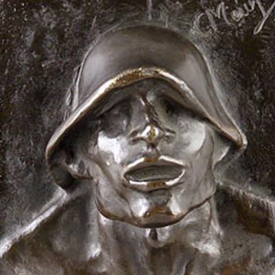 D’une remarquable qualité de fonte, notre œuvre date de la même année que l’huile sur toile intitulée Le Pays noir. Le personnage aux traits anguleux est un archétype dans l’œuvre de Meunier : on retrouve ces figures de profil, fatiguées par le labeur du Pays noir dans le bas-relief de bronze exposé au Salon de 1893, Mineurs à la sortie du puits, puis dans les plâtres et les plaques de bronze jusqu’à celle commandée en 1904 par le marchand de charbon Édouard Taymans et tirée à plusieurs exemplaires.