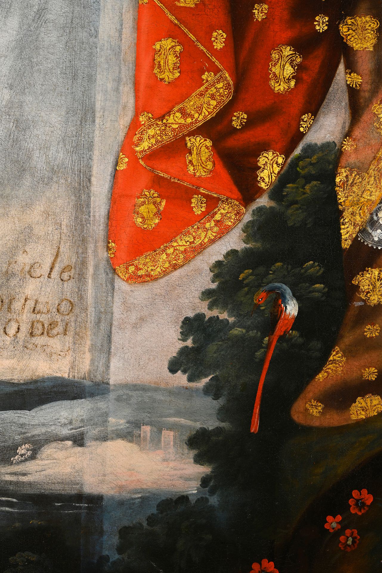 Vêtu de somptueux drapés rehaussés d’or, la figure de ce messager de Dieu annonce sa gloire. Le voile apparaissant sur la gauche de la composition comporte le message « S. Uriele Fortis o[r]io Dei », Uriel fort par la parole de Dieu.